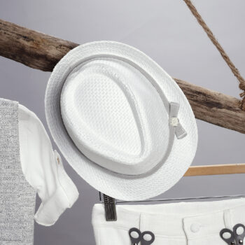 Το σύνολο συνοδεύεται από ψάθινο άσπρο καβουράκι με κορδέλα από το ύφασμα του παντελονιού.