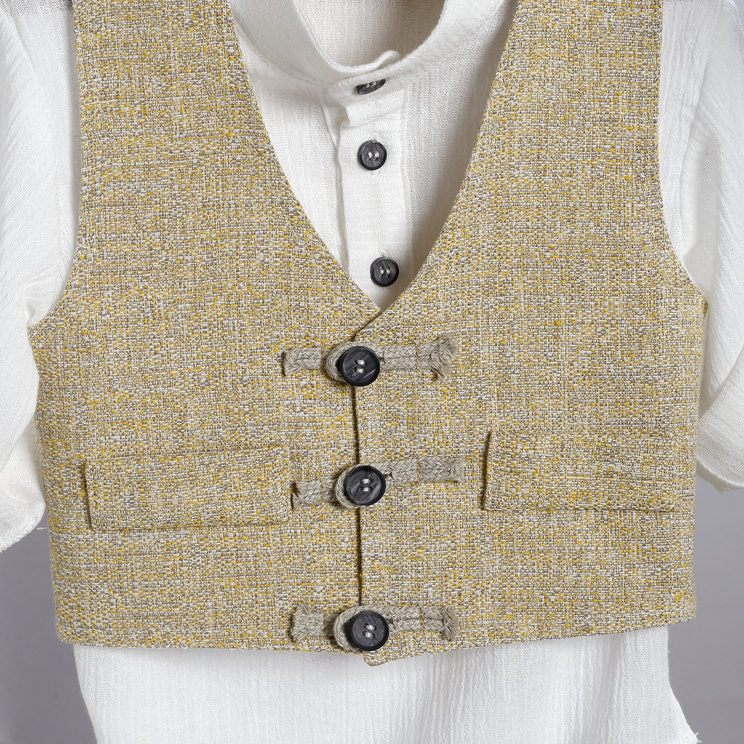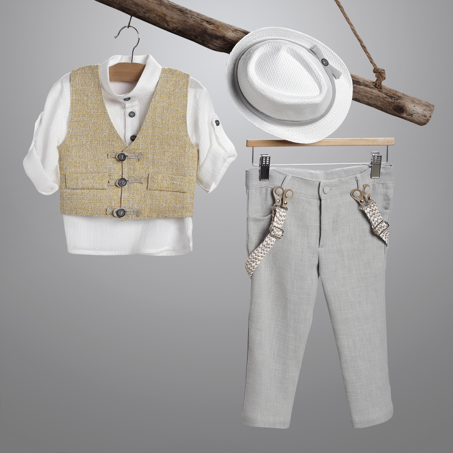 Γκρι ραμί παντελόνι, άσπρο βαμβακερό πουκάμισο και χρυσαφί καμπαρντίνα γιλέκο.