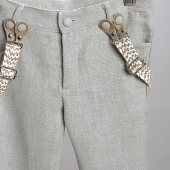 Παντελόνι ραμί σε γκρι χρώμα. Εσωτερικά υπάρχει λάστιχο με κουμπότρυπα για τη ρύθμιση της μέσης. Διατίθεται επίσης σε εκρού, μπεζ, πράσινο και σιέλ χρώμα. Συνοδεύεται από πλεκτές τιράντες.