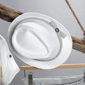 Το σύνολο συνοδεύεται από ψάθινο άσπρο καβουράκι με κορδέλα από το ύφασμα του παντελονιού.