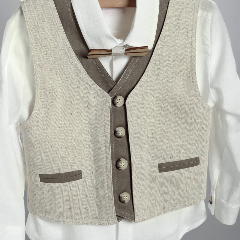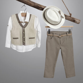 Το σύνολο συνοδεύεται με ξύλινο παπιόν και ψάθινο εκρού καβουράκι με κορδέλα από το ύφασμα του παντελονιού.