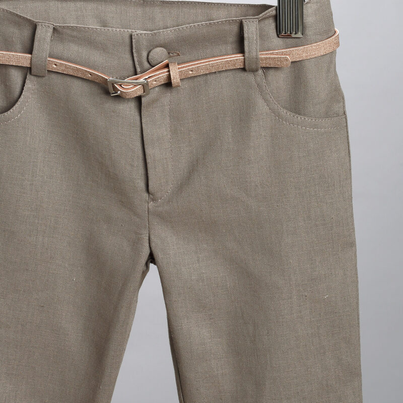 Παντελόνι καμπαρντίνα σε καφέ χρώμα. Εσωτερικά υπάρχει λάστιχο με κουμπότρυπα για τη ρύθμιση της μέσης. Διατίθεται επίσης σε εκρού, λαδί και ραφ χρώμα. Συνοδεύεται από σταθερή ζώνη.