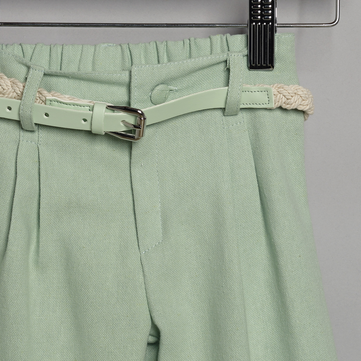 Παντελόνι καμπαρντίνα σε βεραμάν χρώμα. Εσωτερικά υπάρχει λάστιχο με κουμπότρυπα για τη ρύθμιση της μέσης. Διατίθεται επίσης σε μπεζ, σιέλ και μπλε τζην χρώμα. Συνοδεύεται από σταθερή πλεκτή ζώνη. Πουκαμίσα βαμβακερή σε εκρού χρώμα. Εσωτερικά του μανικιού υπάρχει θυλάκι, για να στερεώνεται το μανίκι όταν είναι σηκωμένο. Διατίθεται σε πολλά χρώματα. Γιλέκο καμβάς καμπαρντίνα σε μπεζ χρώμα.Το γιλέκο διατρέχει κορδέλα η οποία δένει με φιόγκο στο δεξί μέρος. Το σύνολο συνοδεύεται με ψάθινο εκρού καβουράκι με κορδέλα ίδια με αυτή του γιλέκου.
