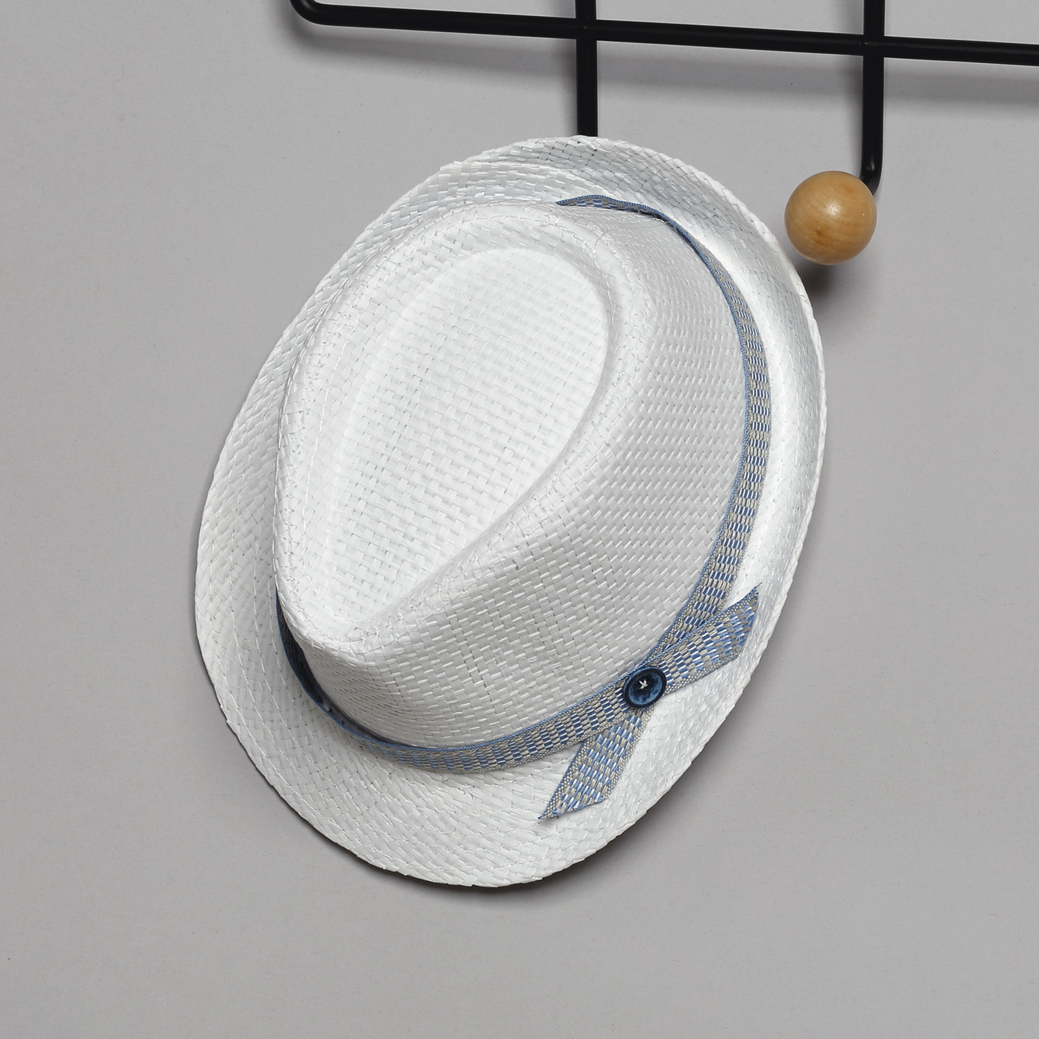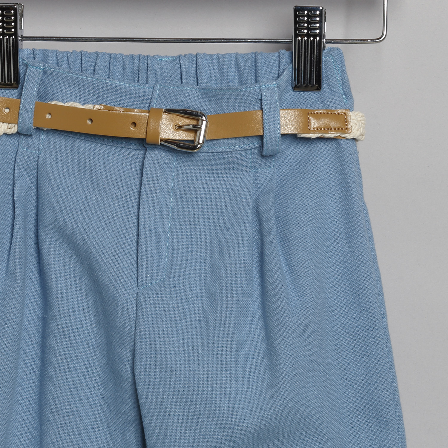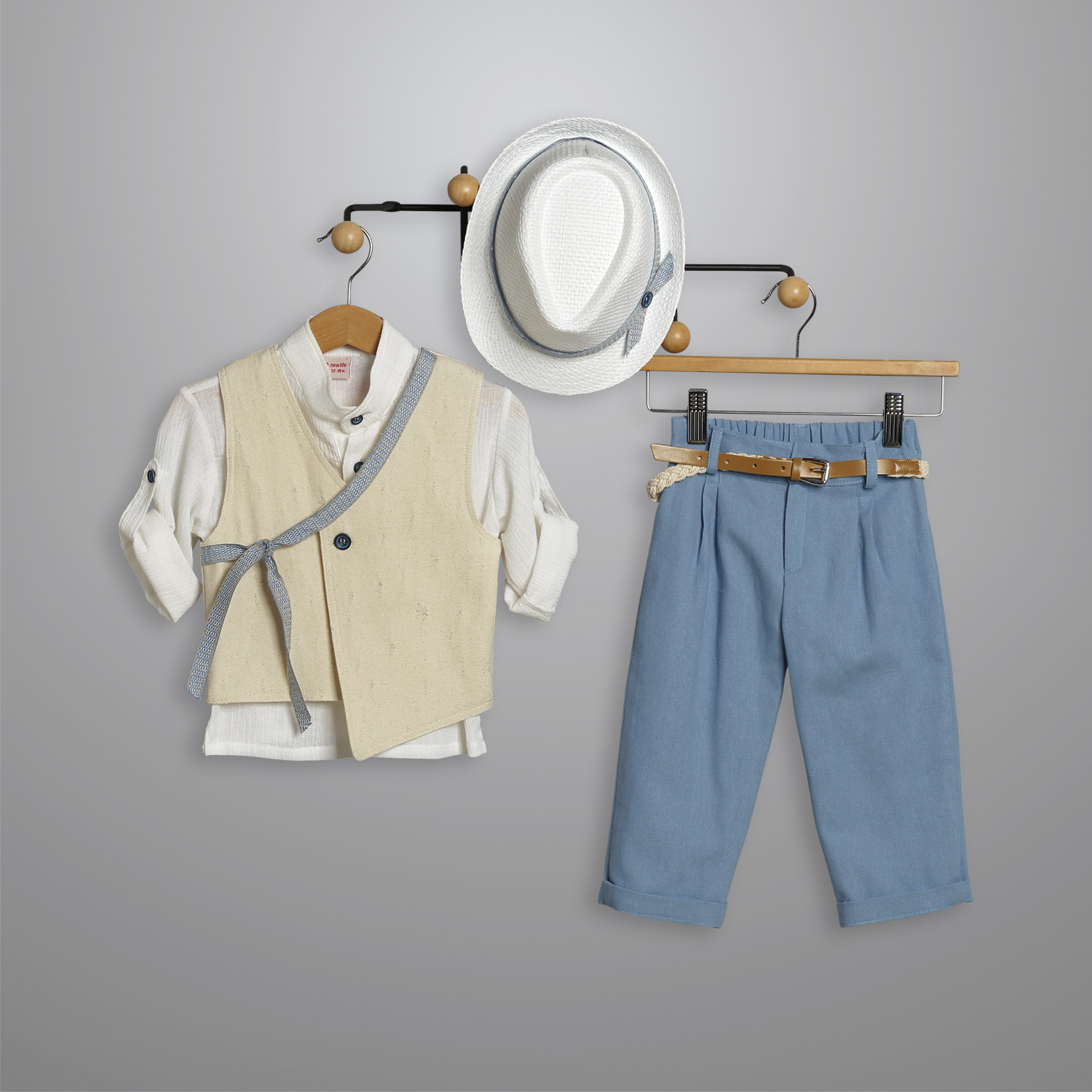 Παντελόνι καμπαρντίνα σε σιέλ χρώμα. Εσωτερικά υπάρχει λάστιχο με κουμπότρυπα για τη ρύθμιση της μέσης. Διατίθεται επίσης σε μπεζ, βεραμάν και μπλε τζην χρώμα. Συνοδεύεται από σταθερή πλεκτή ζώνη. Πουκαμίσα βαμβακερή σε άσπρο χρώμα. Εσωτερικά του μανικιού υπάρχει θυλάκι, για να στερεώνεται το μανίκι όταν είναι σηκωμένο. Διατίθεται σε πολλά χρώματα. Γιλέκο καμβάς καμπαρντίνα σε μπεζ χρώμα.Το γιλέκο διατρέχει κορδέλα η οποία δένει με φιόγκο στο δεξί μέρος. Το σύνολο συνοδεύεται με ψάθινο άσπρο καβουράκι με κορδέλα ίδια με αυτή του γιλέκου.