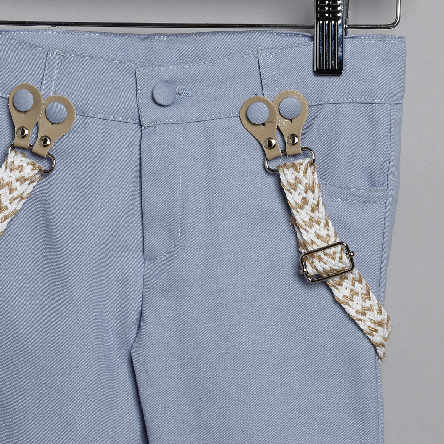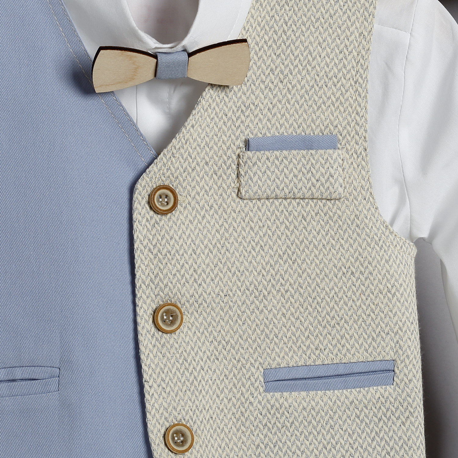 Σιέλ καμπαρντίνα παντελόνι, άσπρο βαμβακερό πουκάμισο και σιέλ-μπεζ ψαροκόκκαλο καμπαρντίνα γιλέκο.