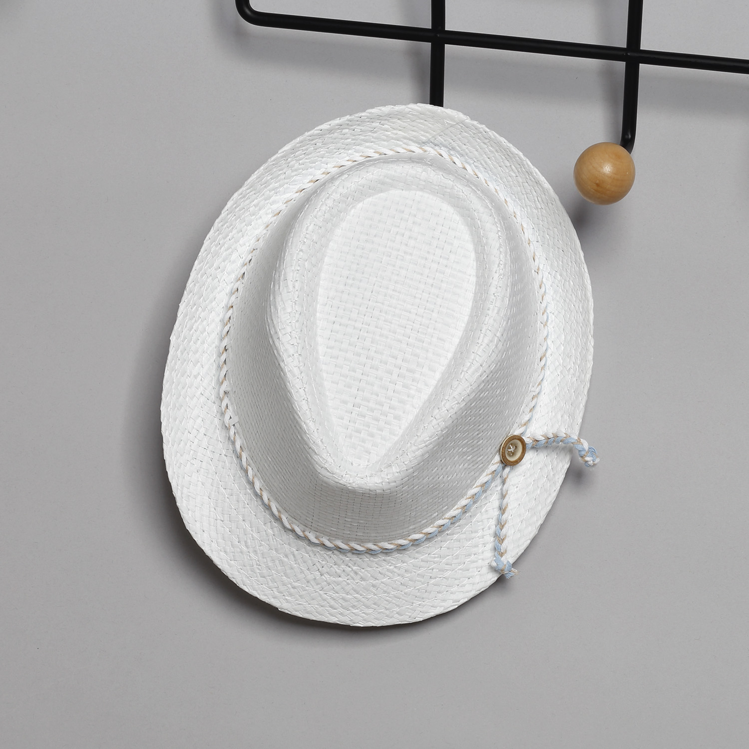 Παντελόνι καμπαρντίνα σε σιέλ χρώμα. Εσωτερικά υπάρχει λάστιχο με κουμπότρυπα για τη ρύθμιση της μέσης. Διατίθεται επίσης σε άσπρο, εκρού, μπεζ, βεραμάν, λαδί, και μπλε χρώμα. Συνοδεύεται από σταθερές πλεκτές τιράντες. Πουκάμισο βαμβακερό άσπρο μονόχρωμο. Εσωτερικά του μανικιού υπάρχει θυλάκι, για να στερεώνεται το μανίκι όταν είναι σηκωμένο. Διατίθεται σε πολλά χρώματα. Γιλέκο με δυο διαφορετικές πλευρές. Η δεξιά είναι καμπαρντίνα σε σιέλ χρώμα και η αριστερή είναι καμπαρντίνα από εκρού-σιέλ ψαροκόκκαλο. Στο γιλέκο υπάρχουν δυο κρυφά τσεπάκια στα πλαινά και ένα στο πέτο. Το σύνολο συνοδεύεται από ξύλινο παπιόν και ψάθινο άσπρο καβουράκι με κορδόνι πλεξούδα.