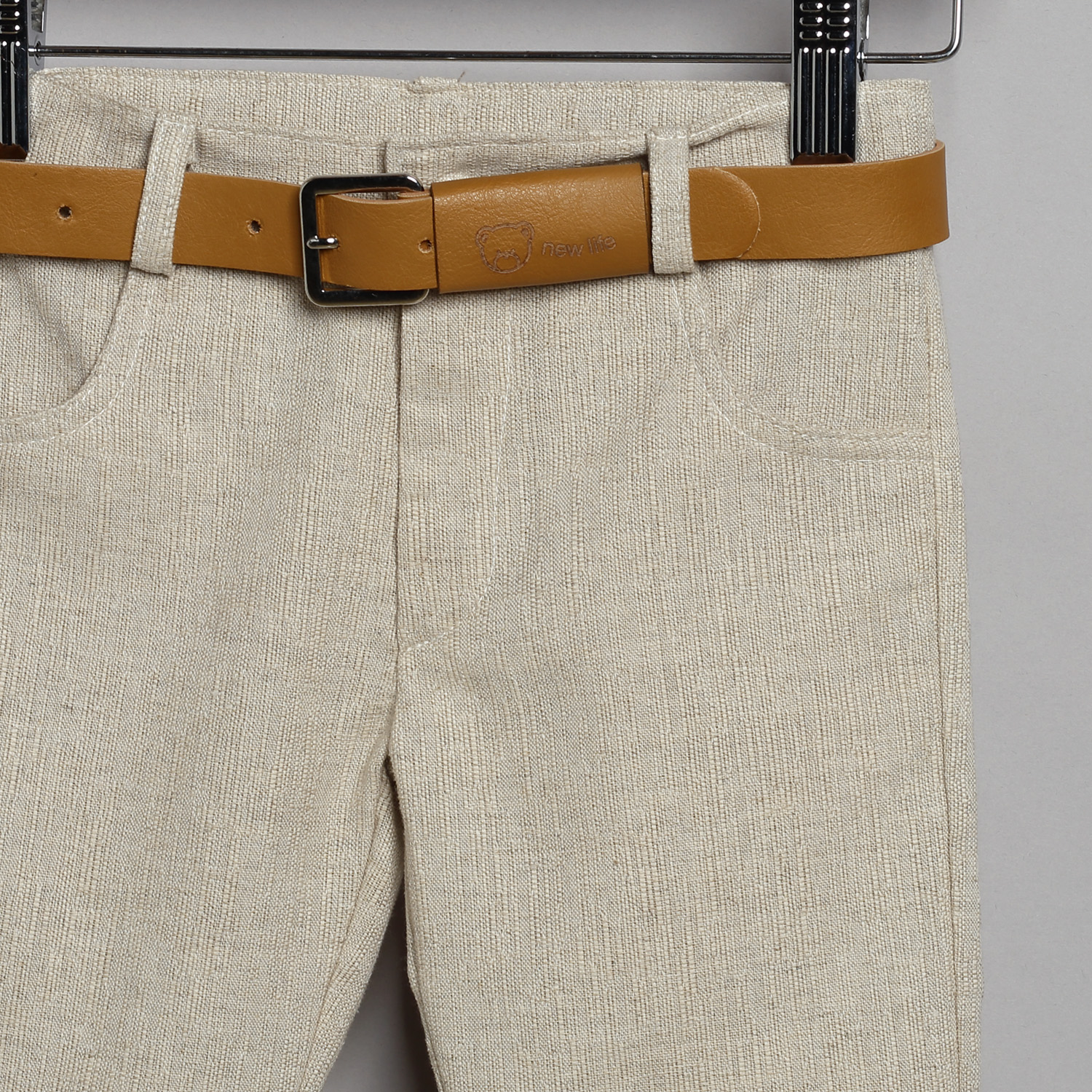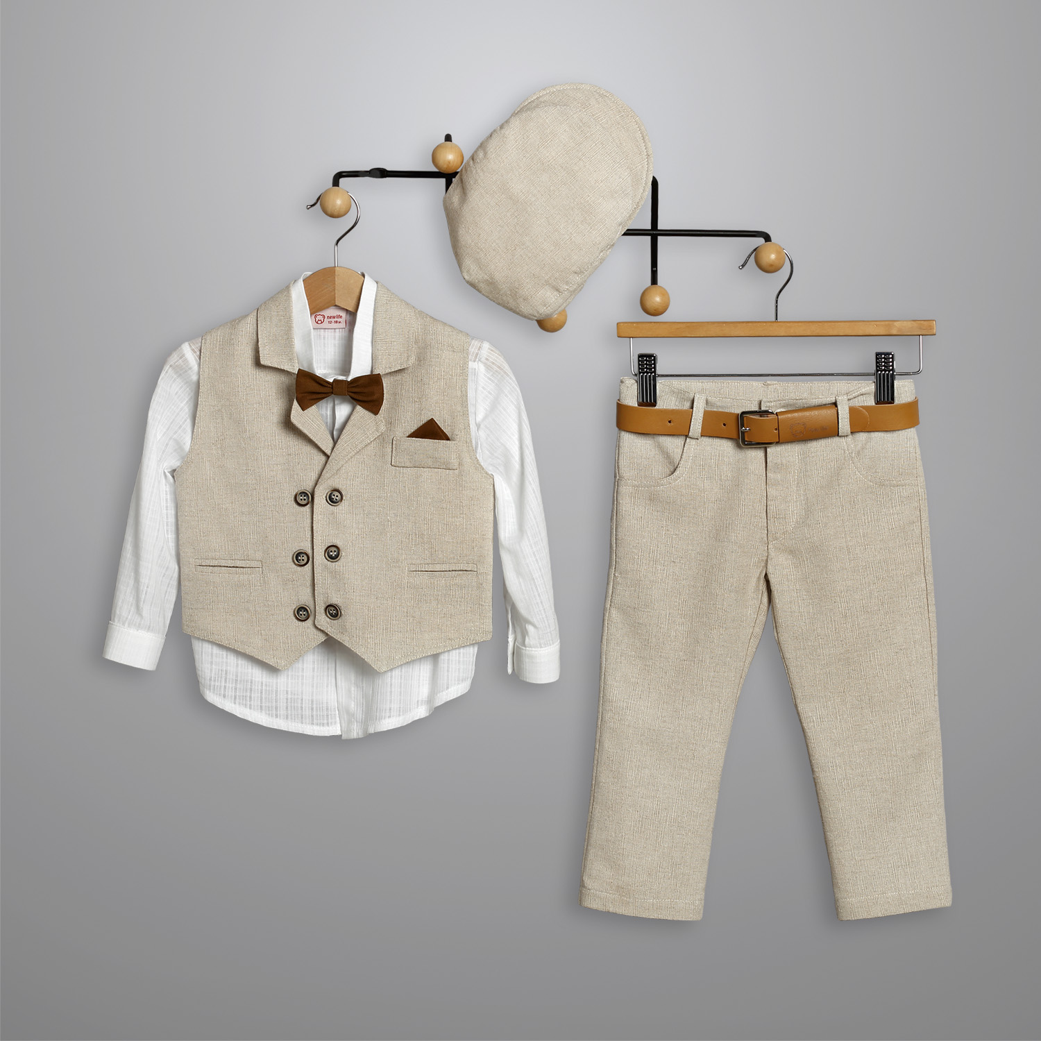 Παντελόνι λινό ψάθα σε μπεζ χρώμα. Εσωτερικά υπάρχει λάστιχο με κουμπότρυπα για τη ρύθμιση της μέσης. Διατίθεται επίσης σε σιέλ και μπλε χρώμα. Συνοδεύεται από σταθερή δερμάτινη ζώνη. Πουκάμισο βαμβακερό άσπρο μονόχρωμο. Εσωτερικά του μανικιού υπάρχει θυλάκι, για να στερεώνεται το μανίκι όταν είναι σηκωμένο. Διατίθεται σε πολλά χρώματα. Γιλέκο λινό ψάθα σε μπεζ χρώμα, με δυο κρυφά τσεπάκια στα πλαινά και ένα στο πέτο με μαντηλάκι. Διατίθεται επίσης σε σιέλ και μπλε χρώμα. Το σύνολο συνοδεύεται από υφασμάτινο παπιόν και τραγιάσκα από το ύφασμα του παντελονιού.