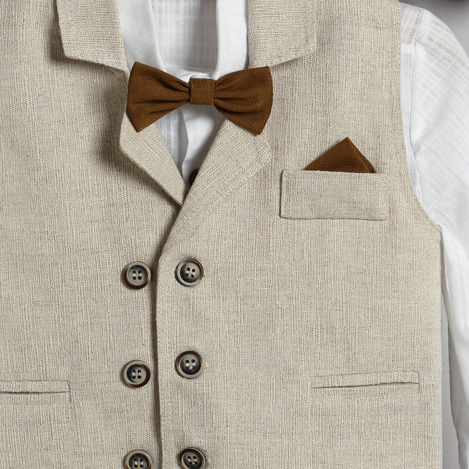 Μπεζ λινό ψάθα παντελόνι, άσπρο βαμβακερό πουκάμισο και μπεζ λινό ψάθα γιλέκο.