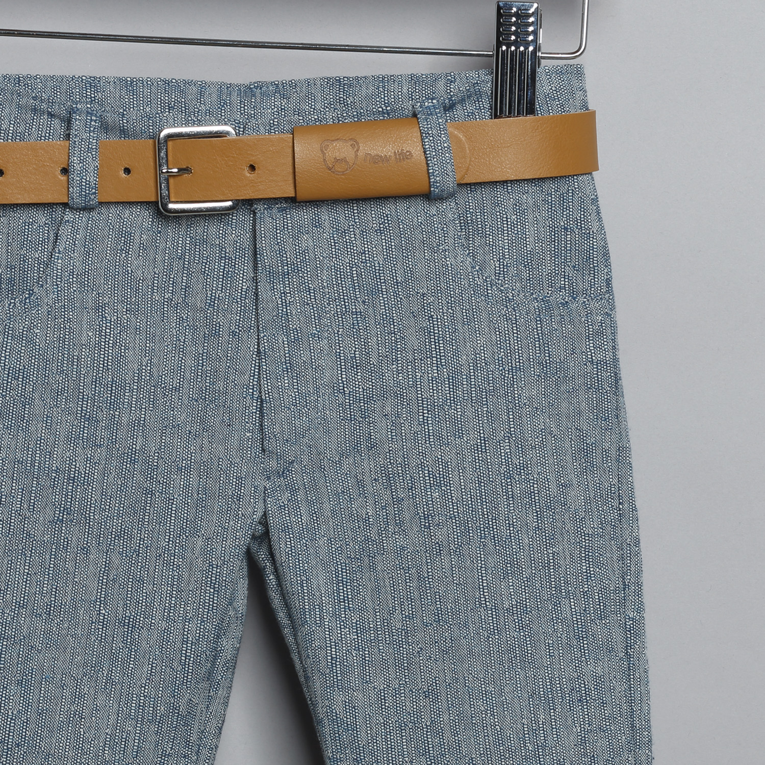 Παντελόνι λινό ψάθα σε μπλε χρώμα. Εσωτερικά υπάρχει λάστιχο με κουμπότρυπα για τη ρύθμιση της μέσης. Διατίθεται επίσης σε μπεζ και σιέλ χρώμα. Συνοδεύεται από σταθερή δερμάτινη ζώνη. Πουκάμισο βαμβακερό άσπρο μονόχρωμο. Εσωτερικά του μανικιού υπάρχει θυλάκι, για να στερεώνεται το μανίκι όταν είναι σηκωμένο. Διατίθεται σε πολλά χρώματα. Γιλέκο λινό ψάθα σε μπλε χρώμα, με δυο κρυφά τσεπάκια στα πλαινά και ένα στο πέτο με μαντηλάκι. Διατίθεται επίσης σε μπεζ και σιέλ χρώμα. Το σύνολο συνοδεύεται από υφασμάτινο παπιόν και τραγιάσκα από το ύφασμα του παντελονιού.