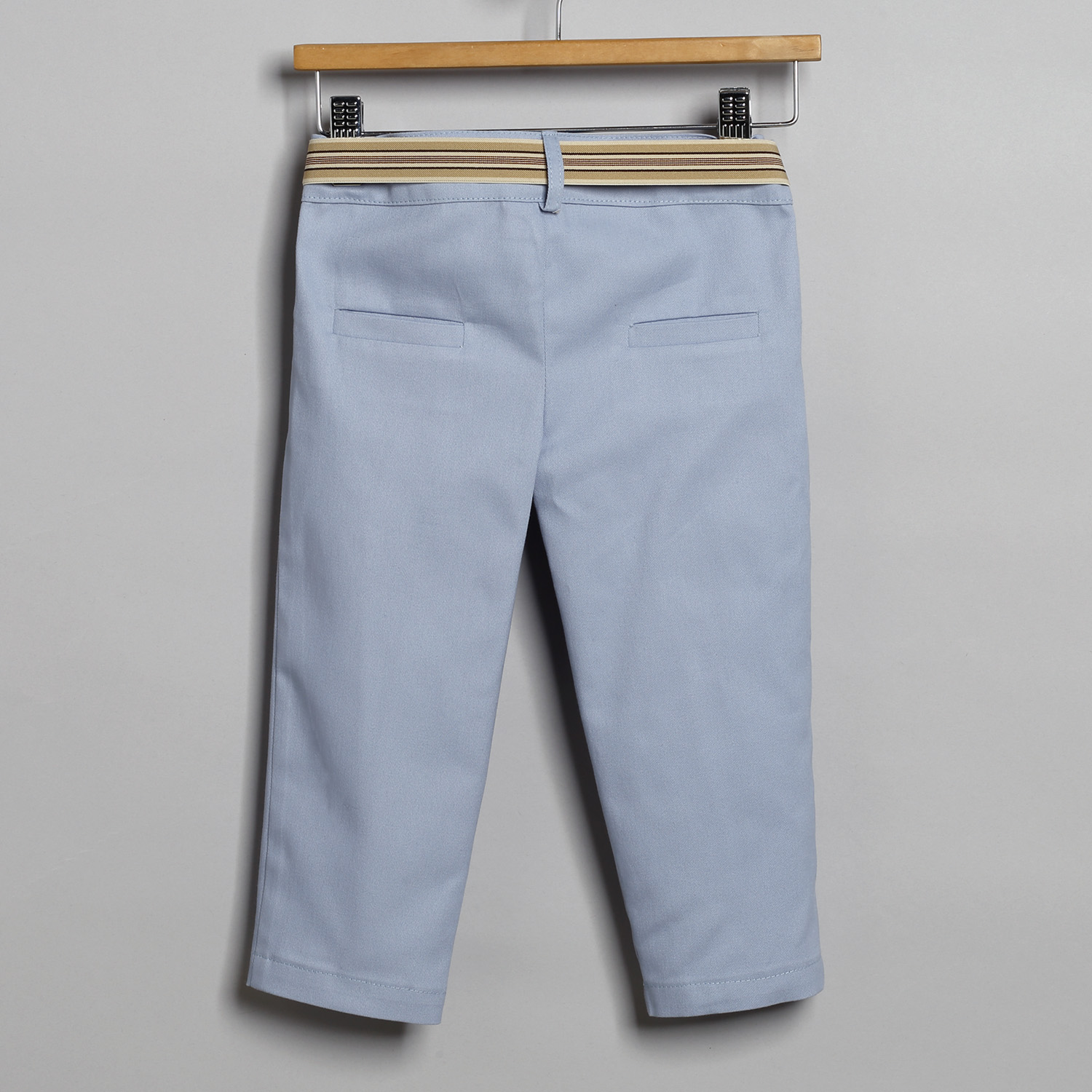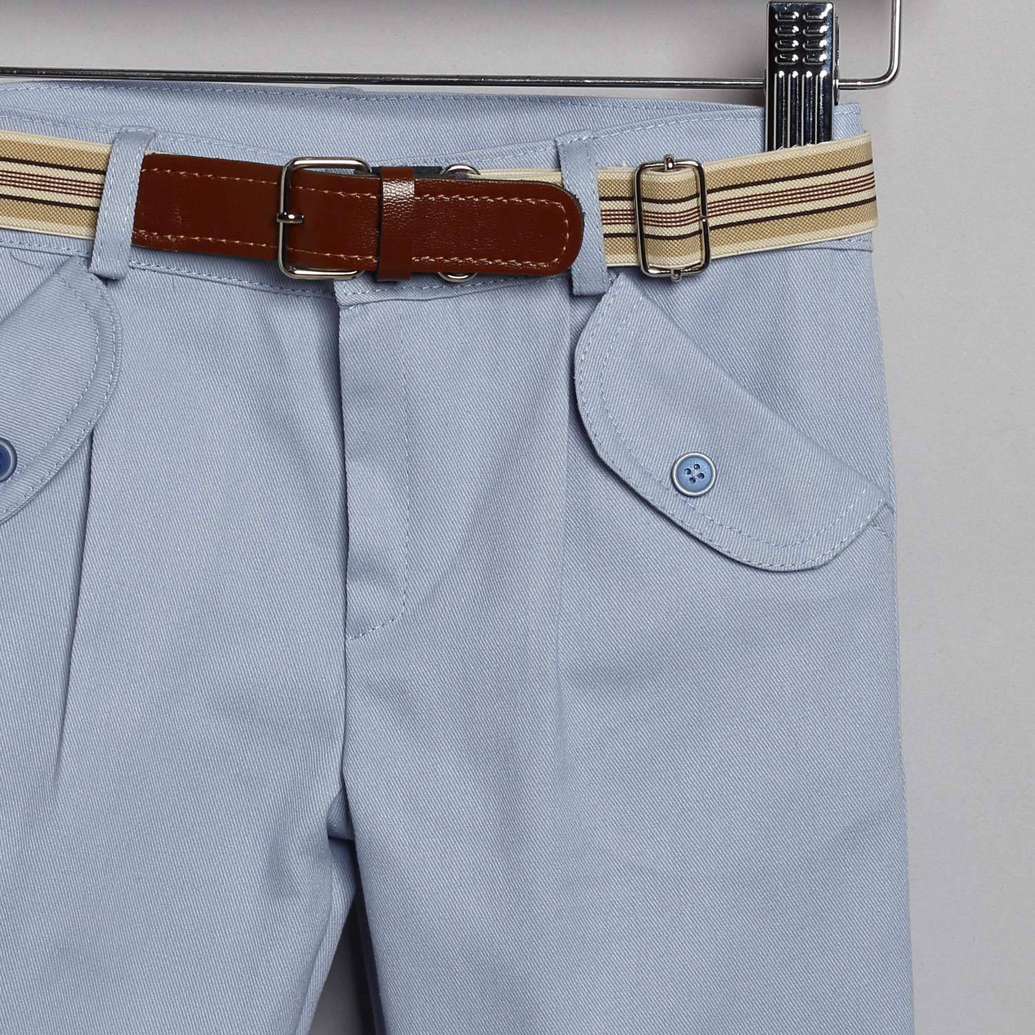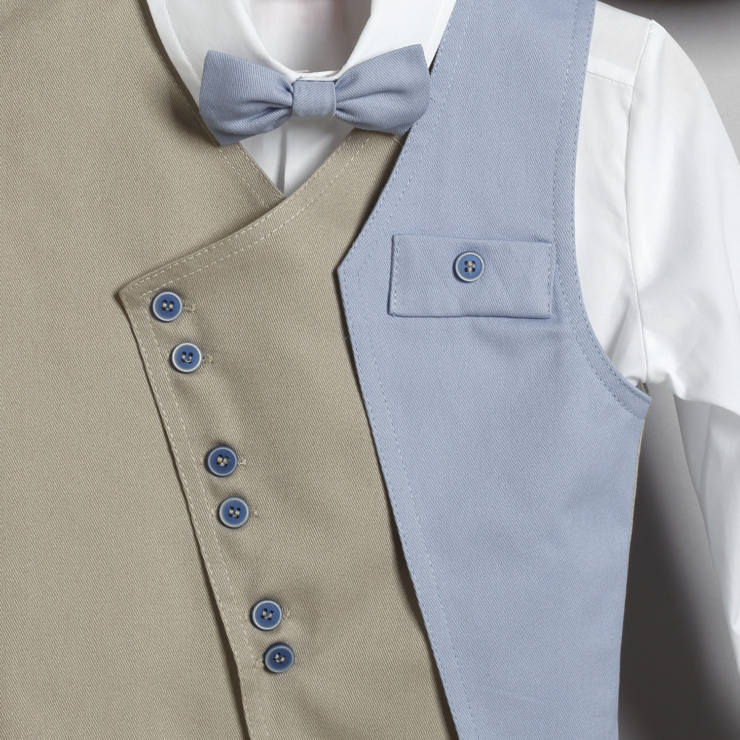 Σιέλ καμπαρντίνα παντελόνι, άσπρο βαμβακερό πουκάμισο και μπεζ-σιέλ καμπαρντίνα γιλέκο.