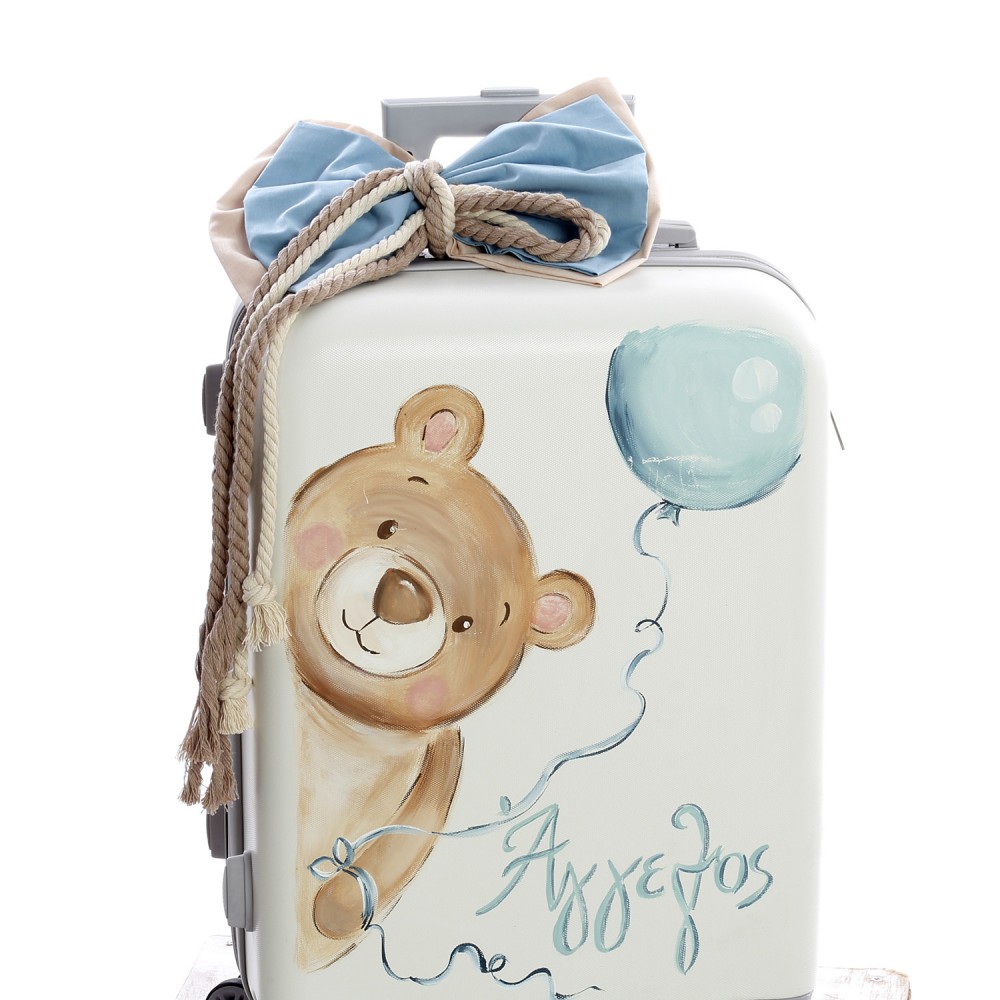 ✔ Βαλίτσα τροχήλατη, ζωγραφισμένη στο χέρι με χαρούμενο αρκουδάκι, μπαλόνι και όνομα, διακοσμημένη με φιόγκους και ναυτικά σχοινιά. (Διαστάσεις: 57cm x 40cm x 22cm)