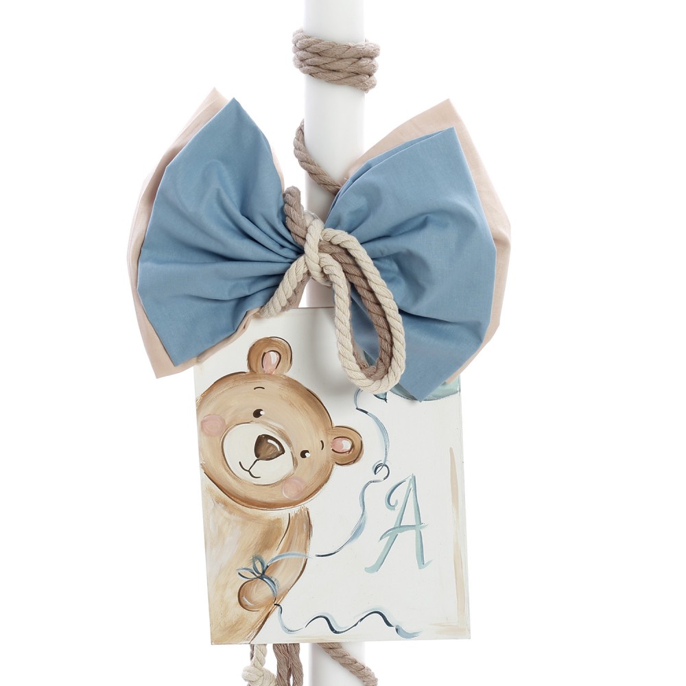 ✔ Λαμπάδα βάπτισης, διακοσμημένη με ξύλινη παράσταση αρκουδάκι, φιόγκο και αέρινα υφάσματα.