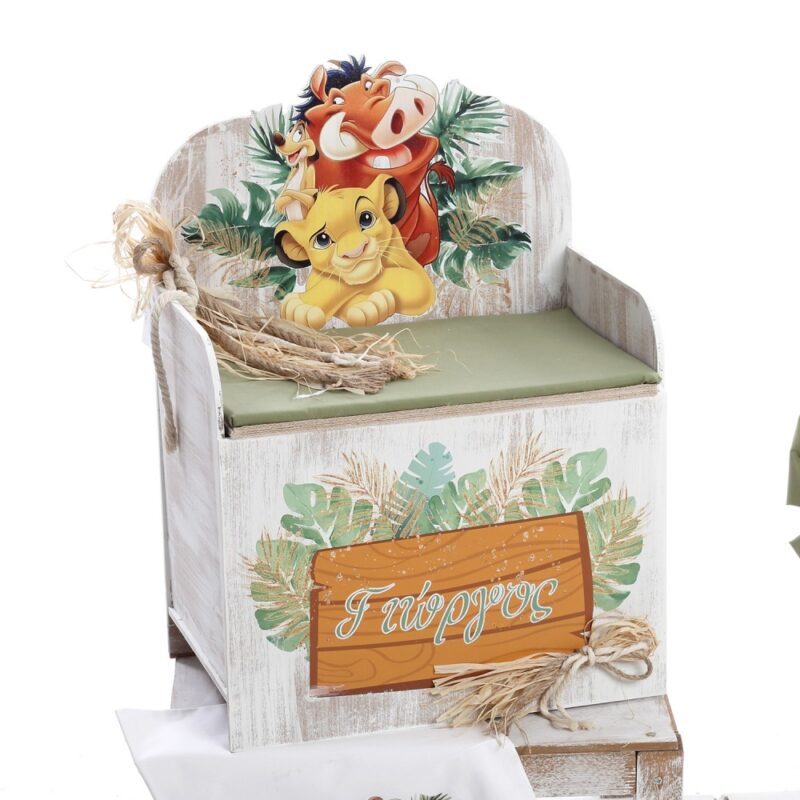 ✔ Ξύλινο παγκάκι-κουτί με UV εκτύπωση χαρακτήρων Lion King και τροπικών φύλλων. (Διαστάσεις: 56cm x 44cm x 36cm)
