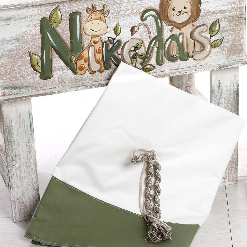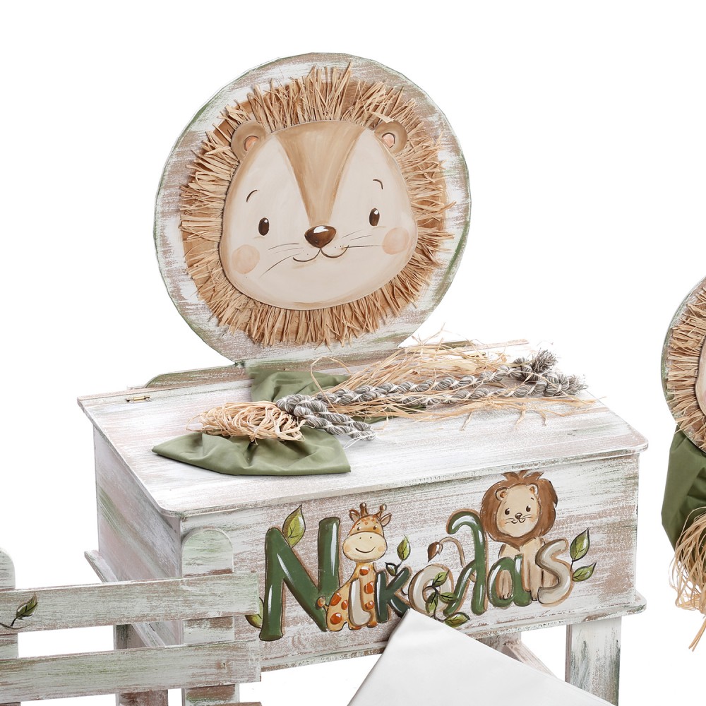 Ολοκληρωμένο βαπτιστικό σετ με θέμα το Λιοντάρι, διακοσμημένο με χειροποίητη ζωγραφική και φυσικά υλικά σε γήινες αποχρώσεις του πράσινου, μπεζ και ξύλου. Ένα ξεχωριστό, rustic σετ για μια μοναδική βάπτιση.