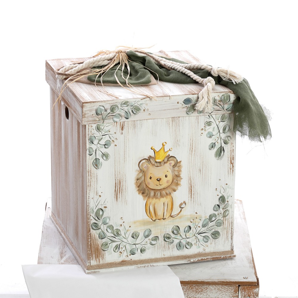 ✔ Ξύλινο κουτί βάπτισης ζωγραφισμένο στο χέρι, με γλυκό λιονταράκι με κορώνα και διακριτικές φυλλωσιές, σε rustic ύφος. (Διαστάσεις: 45cm x 38cm x 38cm)