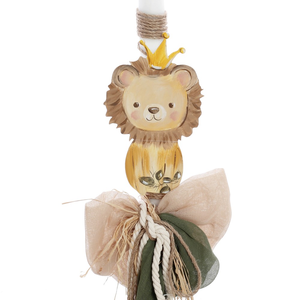 ✔ Λαμπάδα βάπτισης, διακοσμημένη με ξύλινο διακοσμητικό λιονταράκι, κορδέλες από φυσικά υφάσματα.