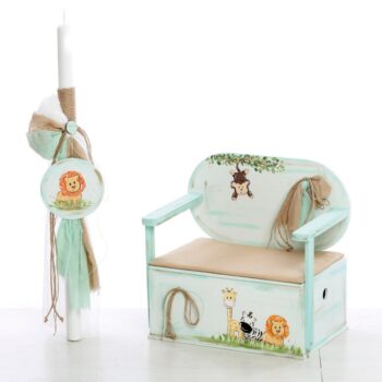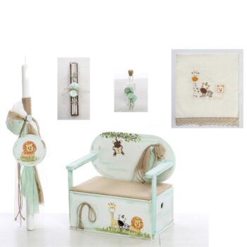 Σετ βάπτισης της εταιρίας Bellissimo με ξύλινο κουτί-παγκάκι με θέμα τα ζώα της ζούγκλας, στους χρωματικούς συνδυασμούς του μπεζ και του βεραμάν.