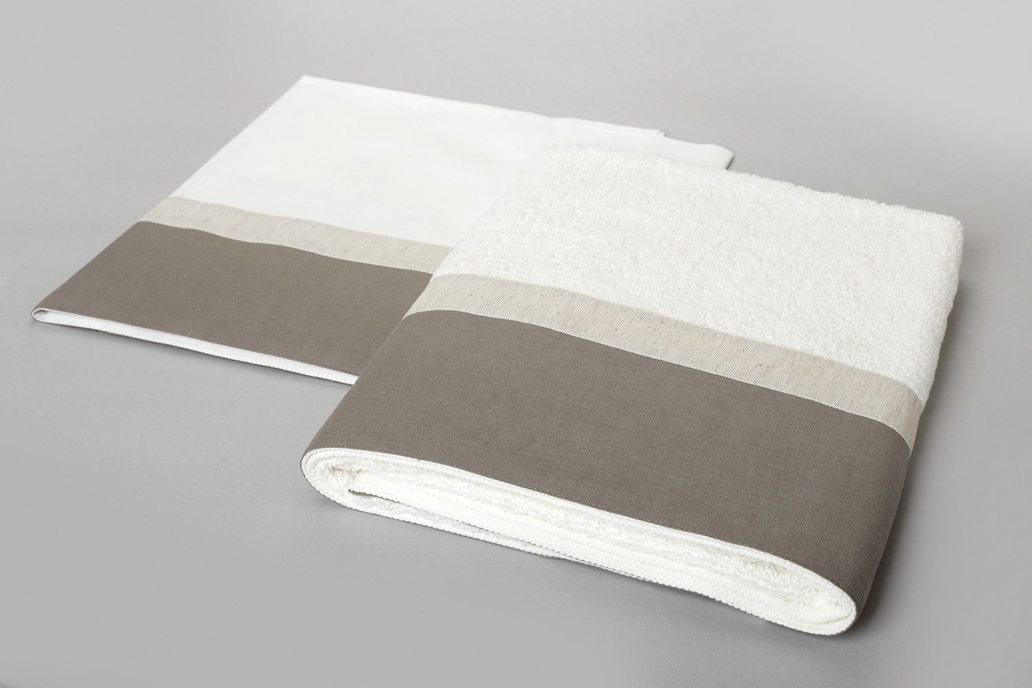 Εκρού πετσέτα με μια μεγάλη φάσα σε καφέ χρώμα και μια μικρή σε εκρού, διαστάσεων 1,40m x 0,80m. Η πετσέτα διατίθεται και σε άσπρο χρώμα, οι φάσες σε μεγάλη ποικιλία χρωμάτων. Εκρού πετσέτα διαστάσεων 0,50m x 0,30m. Η πετσέτα διατίθεται και σε άσπρο χρώμα.