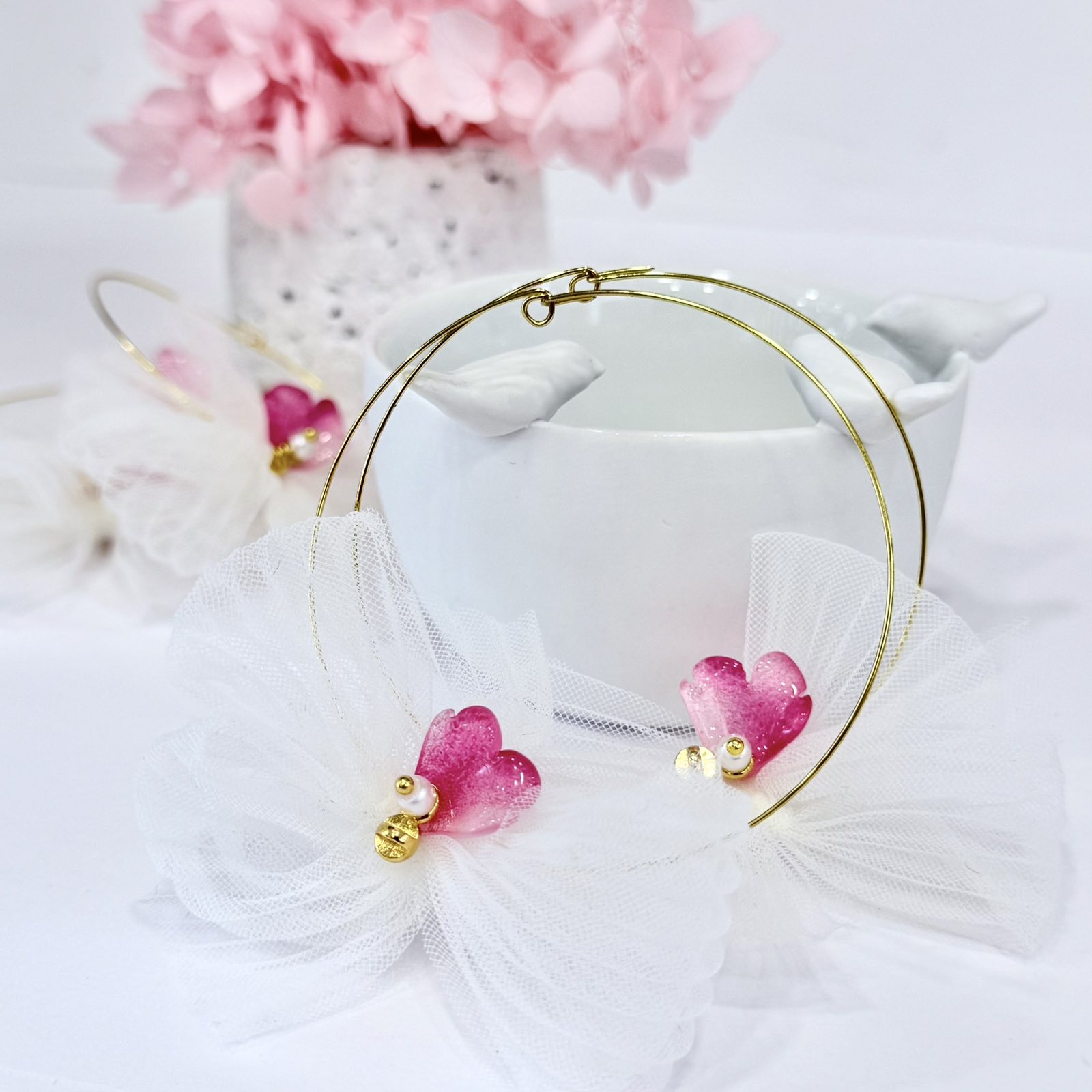 Βραχιόλι ατσάλινο σύρμα φιόγκο τούλι,γύαλινο πέταλο-καρδούλα και σταυρό 24Κ