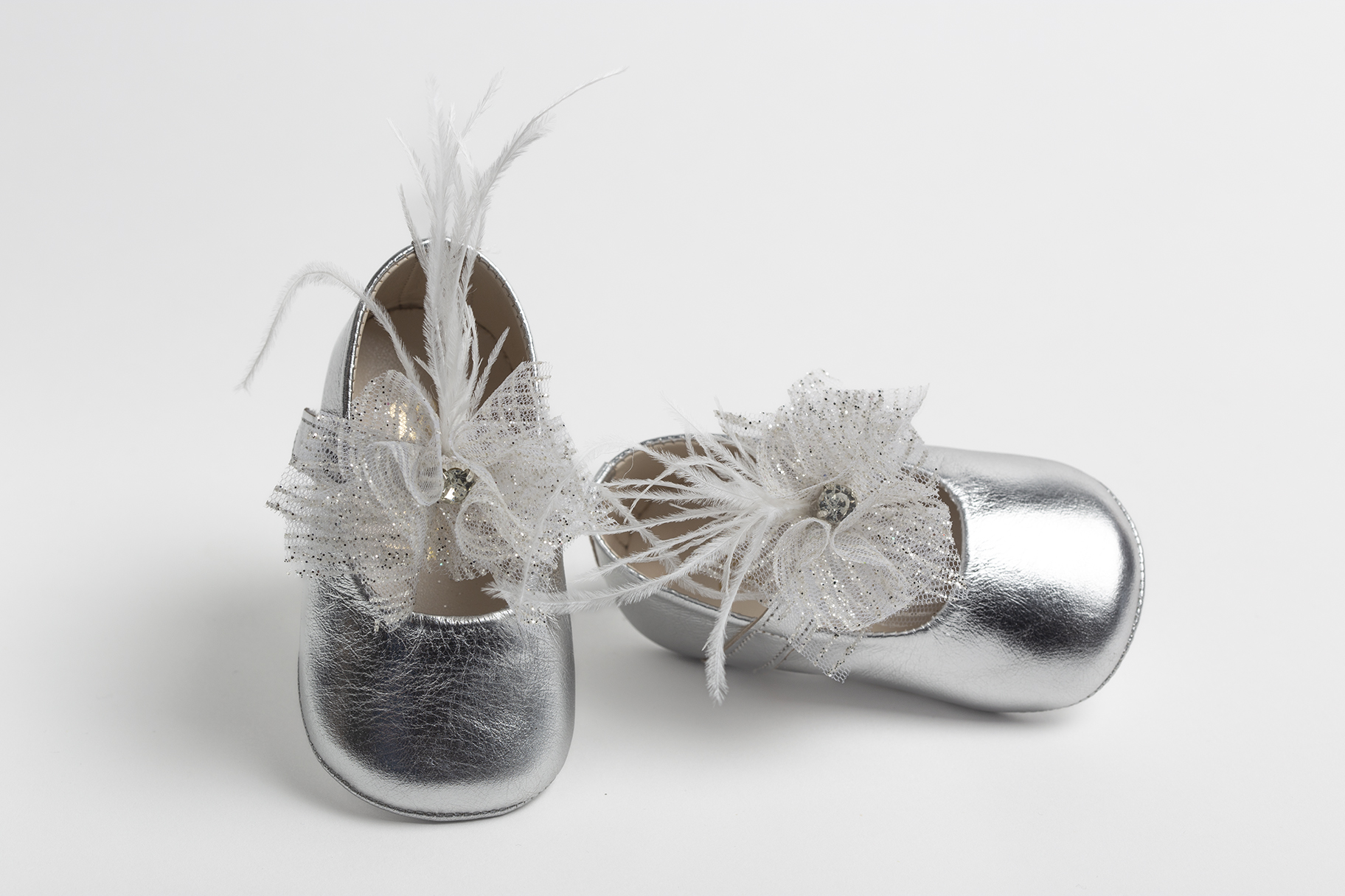 Κ412Α Μπαλαρίνα αγκαλιάς από ασημί δέρμα και διακόσμηση με glitter τούλι, στρας και off white φτερά. Νουμ. 16-19