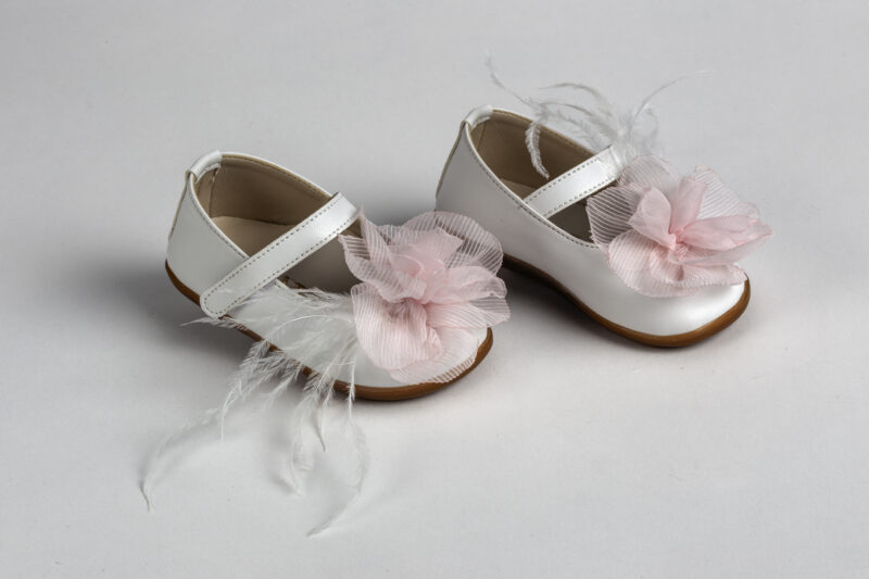 Μπαλαρίνα για τα πρώτα βήματα σε λευκό τεχνόδερμα διακοσμημένη με ροζ τούλινο λουλούδι και φτερό