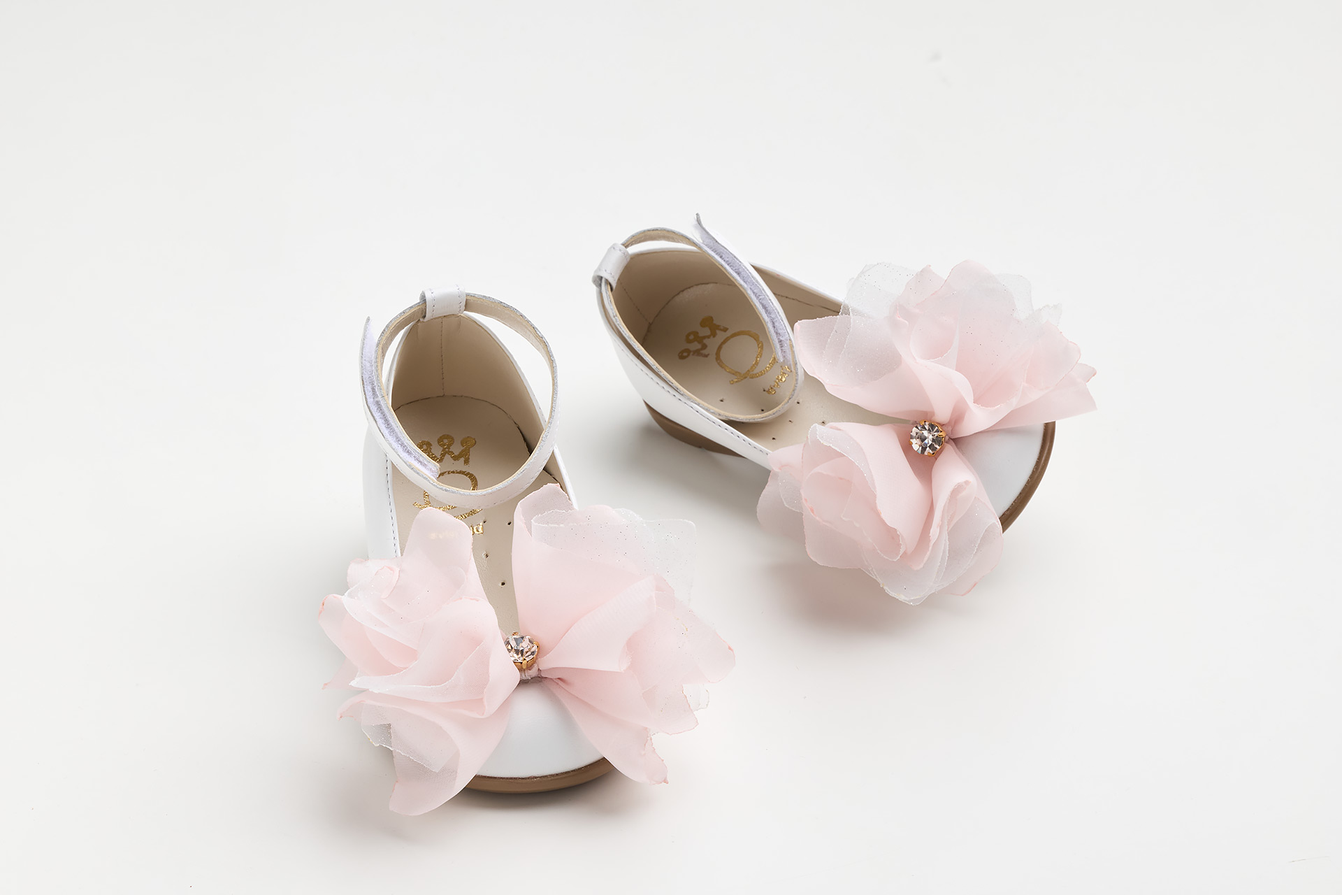 Μπαλαρίνα περπατήματος σε λευκό δέρμα με χειροποίητο διακοσμητικό από ροζ μουσελίνα και στρας