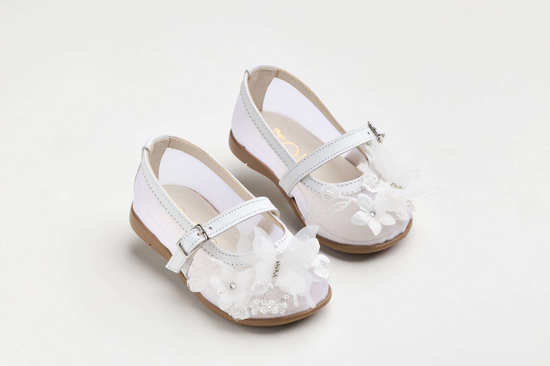 Μπαλαρίνα περπατήματος σε λευκό δέρμα και διαφάνεια κεντημένη με παγιέτες λουλούδι και πεταλούδα με στρας