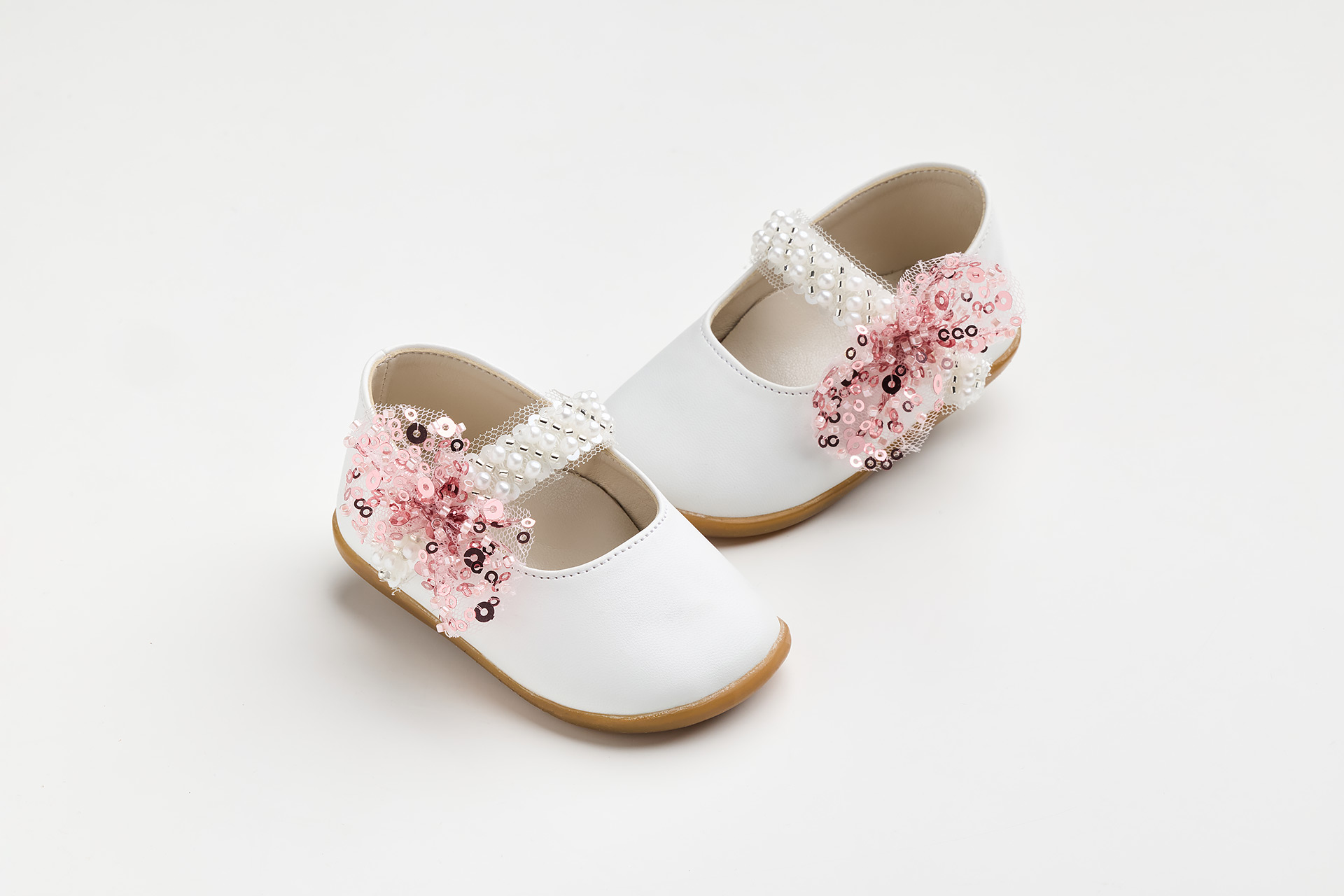 Μπαλαρίνα για τα πρώτα βήματα σε λευκό τεχνόδερμα με πέρλες και φούξ παγιέτες