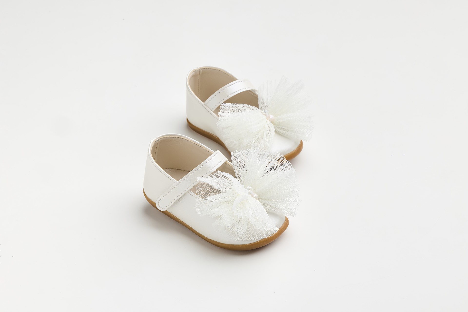 Μπαλαρίνα για τα πρώτα βήματα σε εκρού τεχνόδερμα με χειροποίητο φιόγκο από εκρού πουά πλισέ τούλι