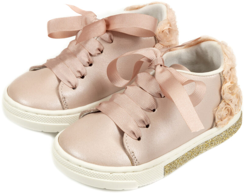 Δερμάτινο Σνίκερ με Φτέρνα απο Chiffon Λουλούδια από Δέρμα Πέρλα σε Ροζ χρώμα