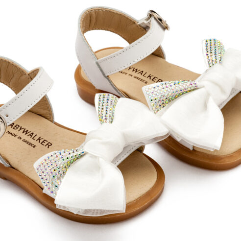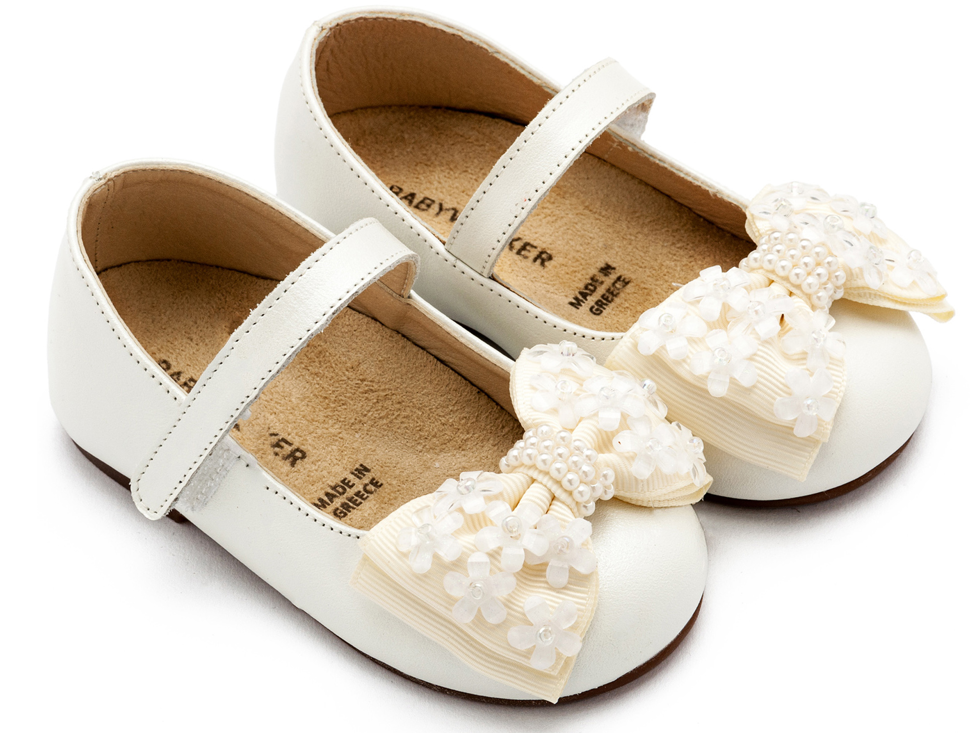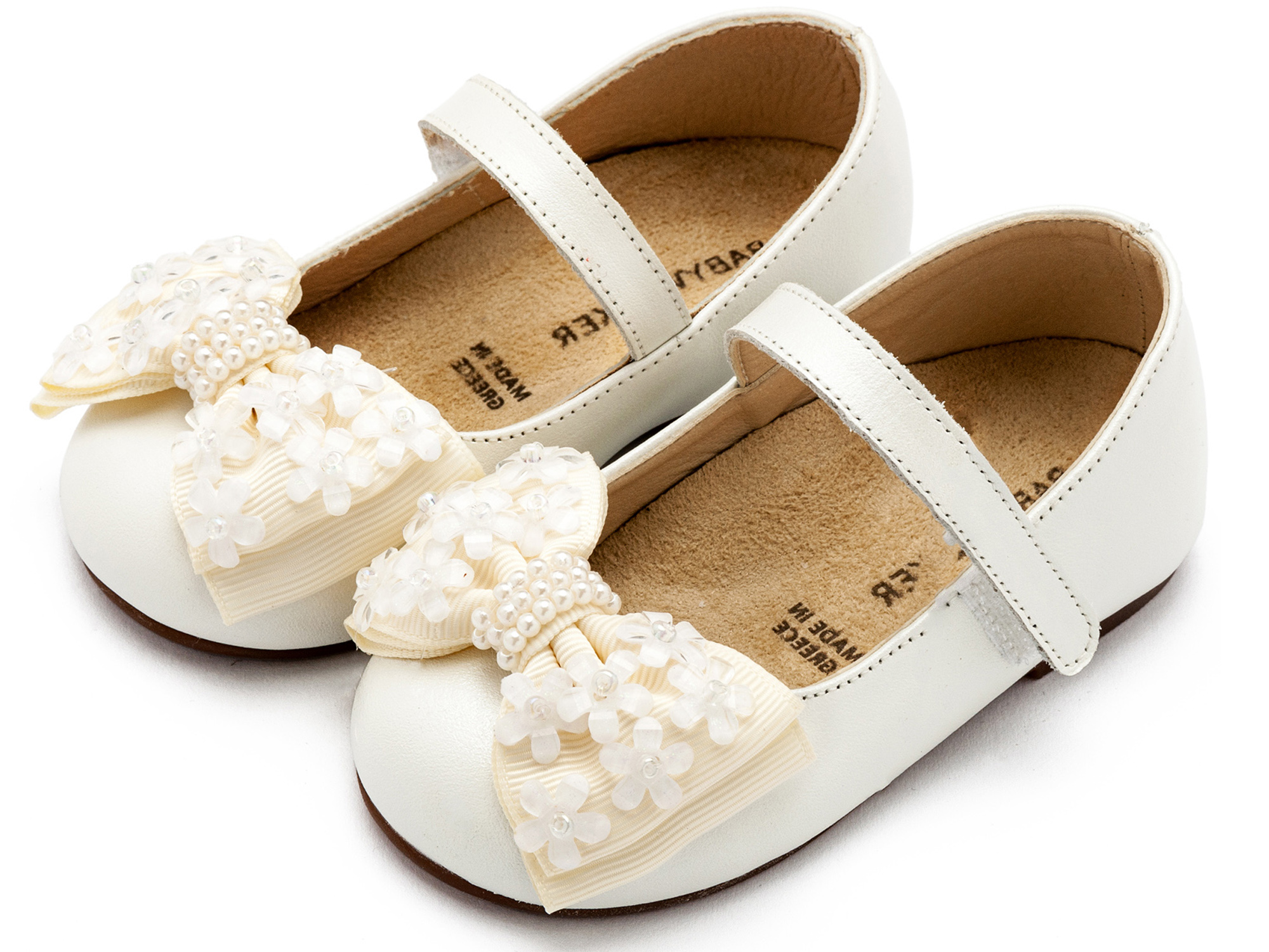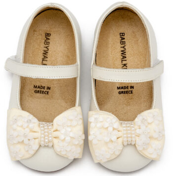 Δερμάτινο Γοβάκι Μονή Μπαρέτα Χρατς με Gros Grain Φιογκάκι και Λουλουδάκια σε Εκρού Χρώμα