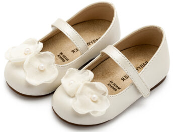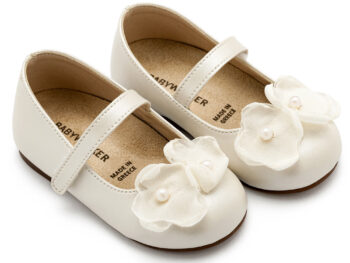 Δερμάτινο Γοβάκι Μονή Μπαρέτα Χρατς με Υφασμάτινα Χειροποίητα Λουλούδια Οργάντζας και Πέρλα σε Εκρού Χρώμα