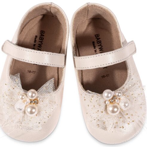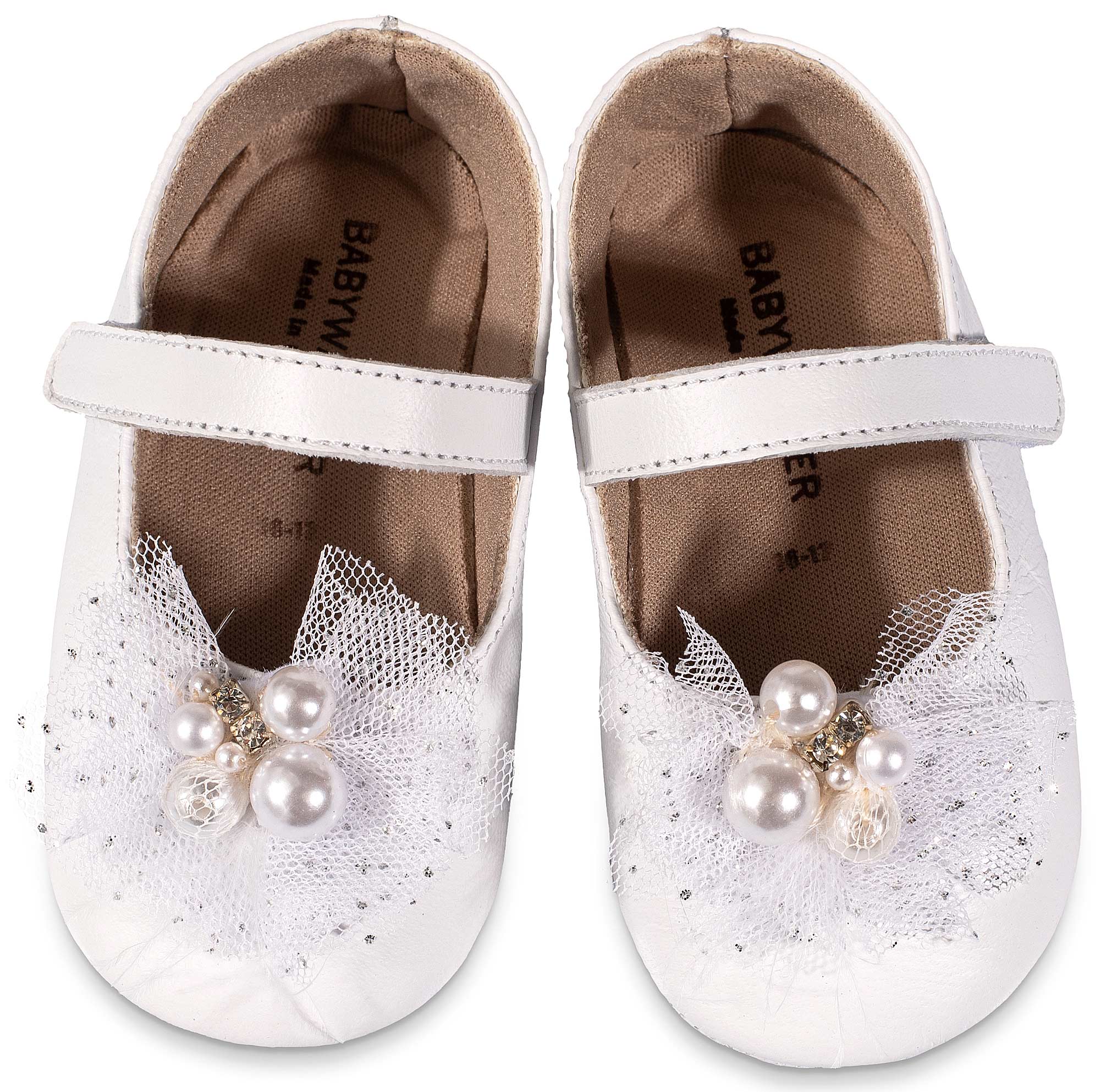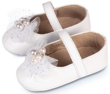 Δερμάτινο Γοβακι Μονή Μπαρέτα με Χειροποίητο Διακοσμητικό απο Τούλι και Πέρλες σε Λευκό Χρώμα