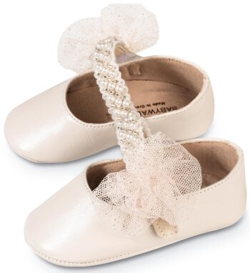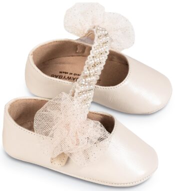 Δερμάτινο Γοβακι Μονή Μπαρέτα με Χειροποίητο Διακοσμητικό απο Τούλι και Πέρλες σε Εκρού Χρώμα