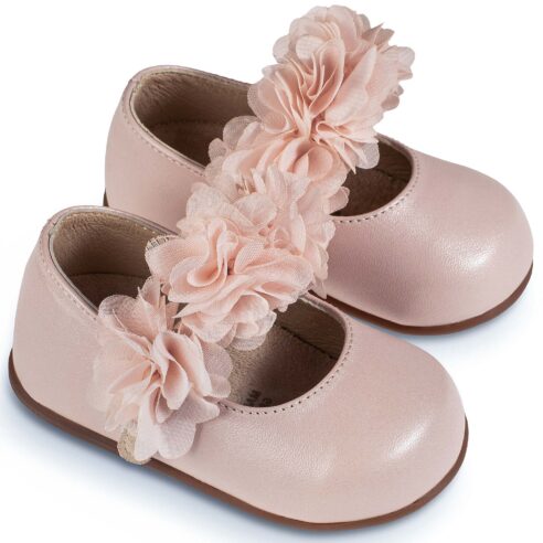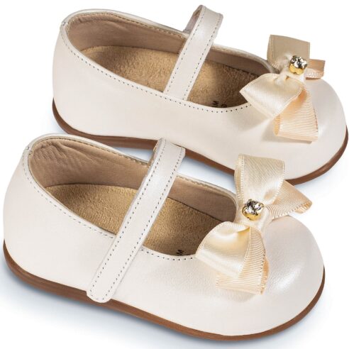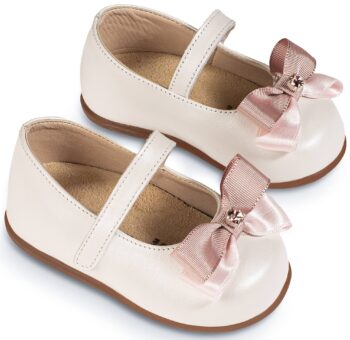 Δερμάτινο Γοβάκι Μονή Μπαρέτα με Χειροποίητο Δίχρωμο Φιόγκο με Στρας σε Εκρού Ροζ Χρώμα