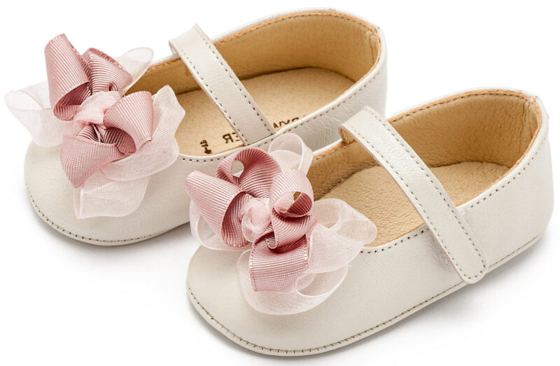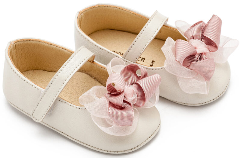 Δερμάτινο Γοβάκι Μονή Μπαρέτα με Υφασμάτινο Χειροποίητο Φιογκάκι σε Εκρού Ροζ Χρώμα