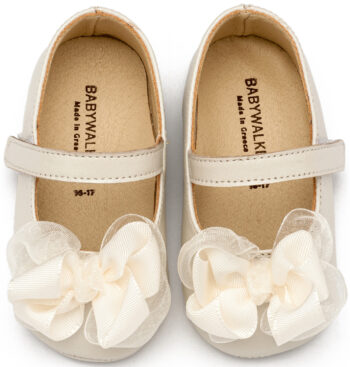 Δερμάτινο Γοβάκι Μονή Μπαρέτα με Υφασμάτινο Χειροποίητο Φιογκάκι σε Εκρού Χρώμα