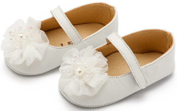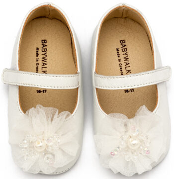 Δερμάτινο Γοβάκι Μονή Μπαρέτα με Υφασμάτινο Λουλούδι με Χάντρες σε Λευκό Χρώμα