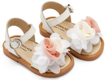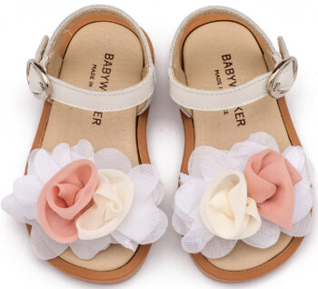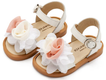 Δερμάτινο Πέδιλο με Χειροποίητο Διακοσμητικό με Chiffon Λουλούδια σε Εκρού Ροζ Χρώμα