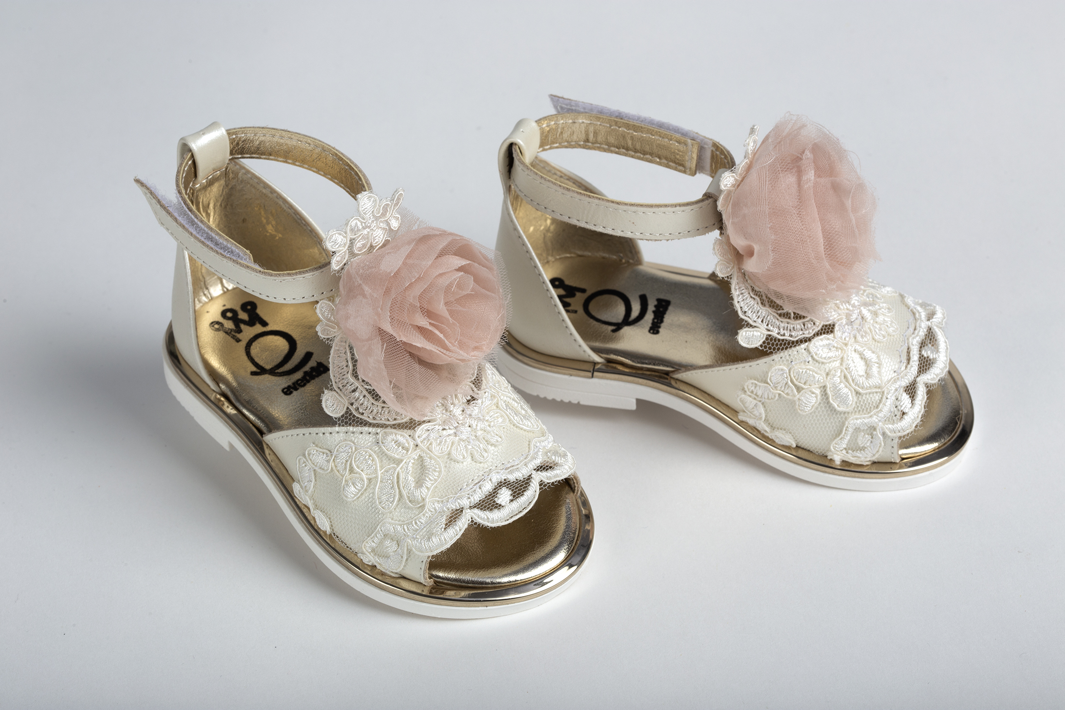 Σανδάλι περπατήματος σε εκρού δέρμα διακοσμημένο με δαντέλα και dusty pink λουλούδι