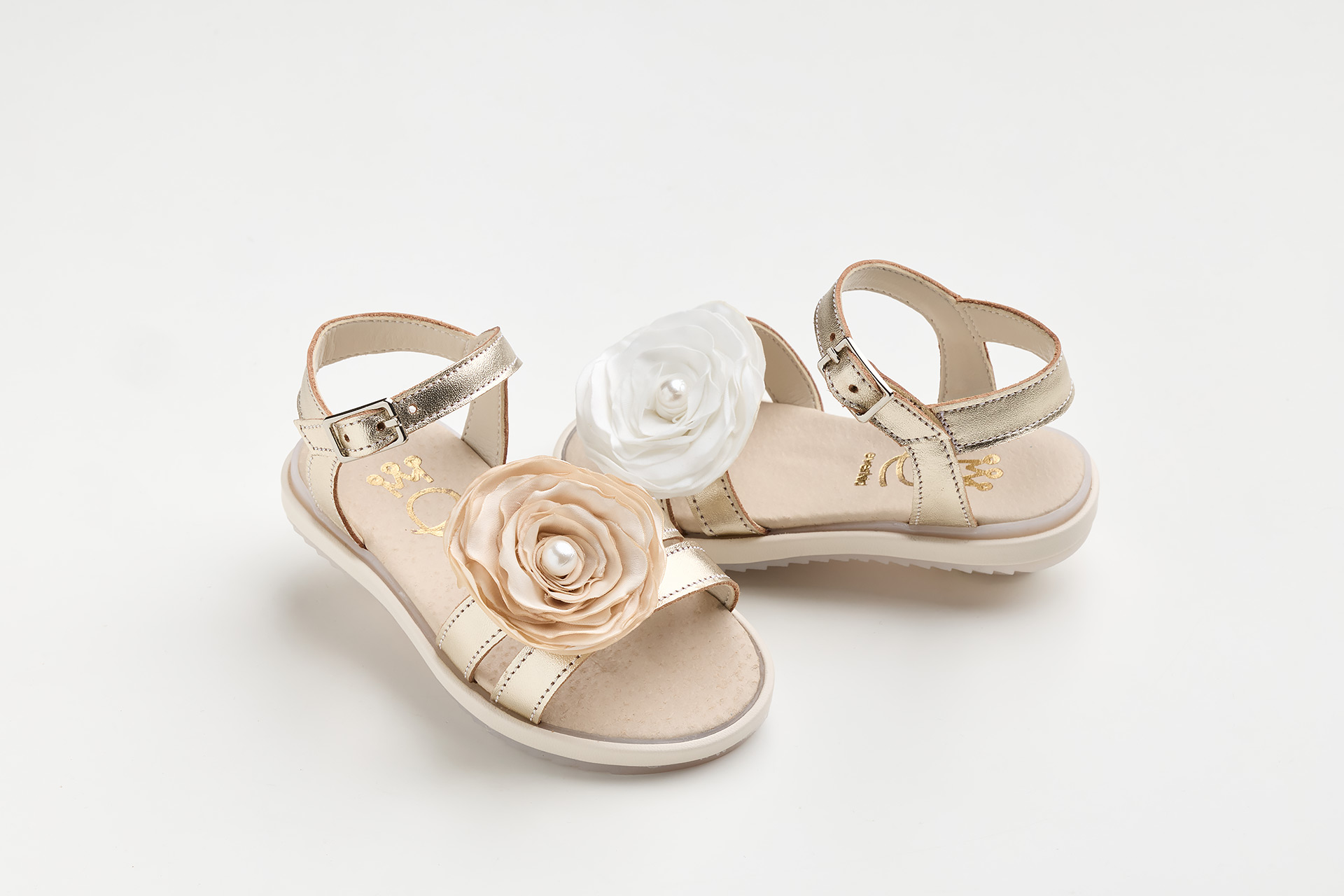 Σανδάλι περπατήματος σε χρυσό δέρμα και off white σατέν χειροποίητο τριαντάφυλλο