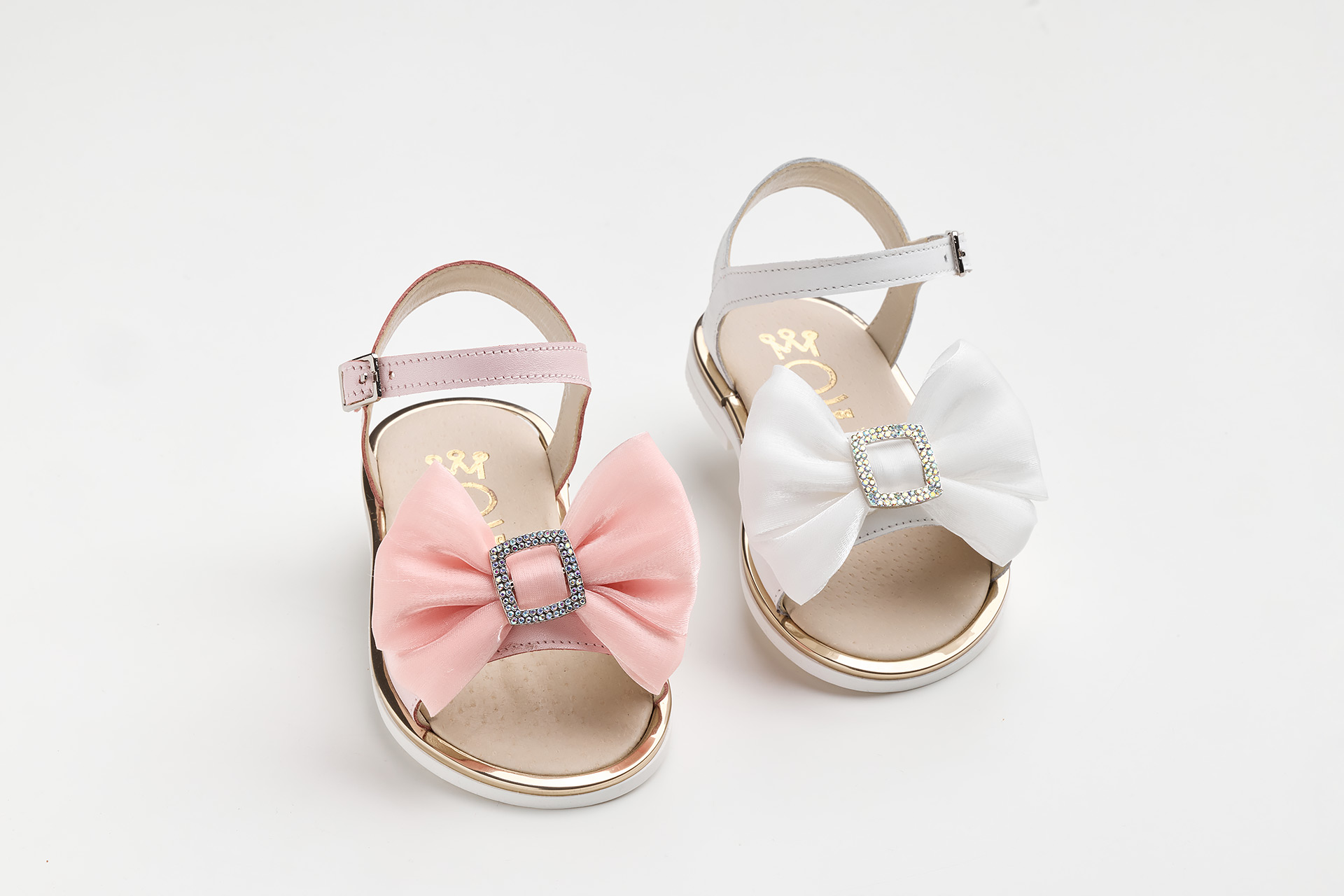 Σανδάλι περπατήματος σε λευκό δέρμα με λευκό φιόγκο και μεταλλικό διακοσμητικό με στρας