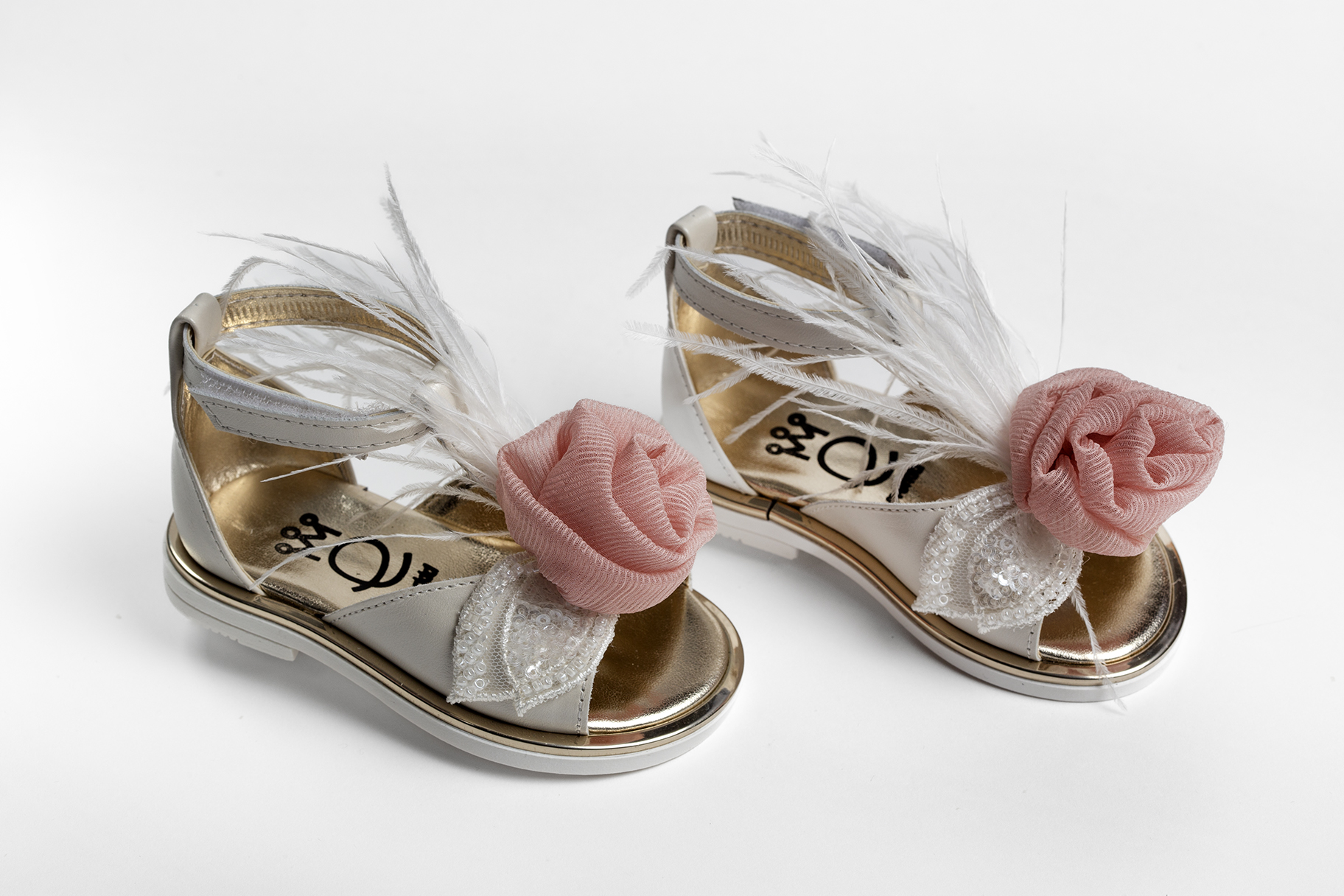 Κ446Ε Σανδάλι περπατήματος από εκρού δέρμα διακοσμημένο με κεντημέη δαντέλα dusty pink τριαντάφυλλο και off white φτερά. Νουμ. 19-27