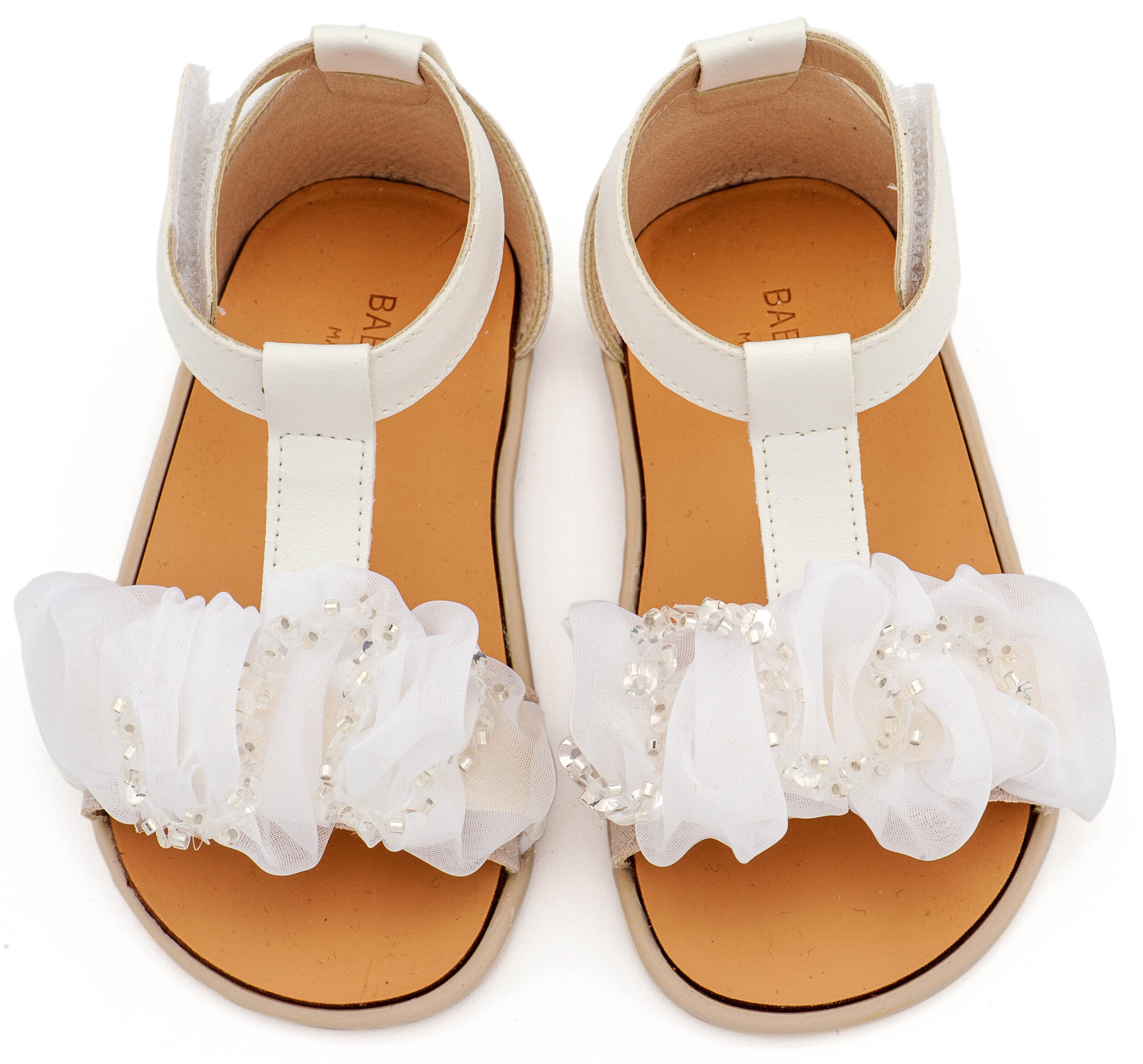 Δερμάτινο Πέδιλο Διακοσμημένο με Χειροποίητο Διακοσμητικό Οργάντζας και Παγιέττες σε Λευκό Χρώμα