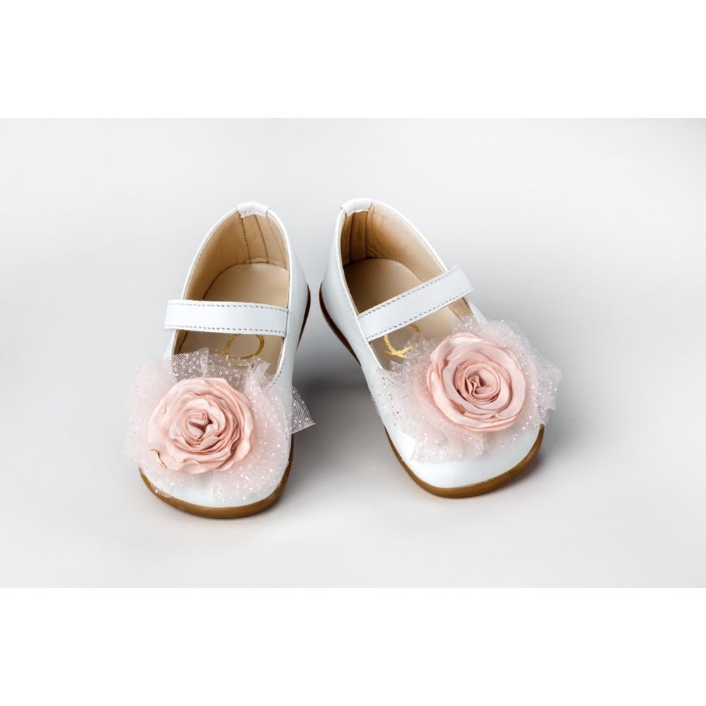 Μπαλαρίνα για τα πρώτα βήματα από λευκό δέρμα διακοσμημένη με τριαντάφυλλο από ροζ σατέν και τούλι με γκλίτερ, κλείσιμο με velcro (“χρατς”).