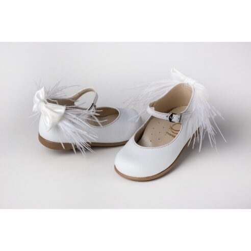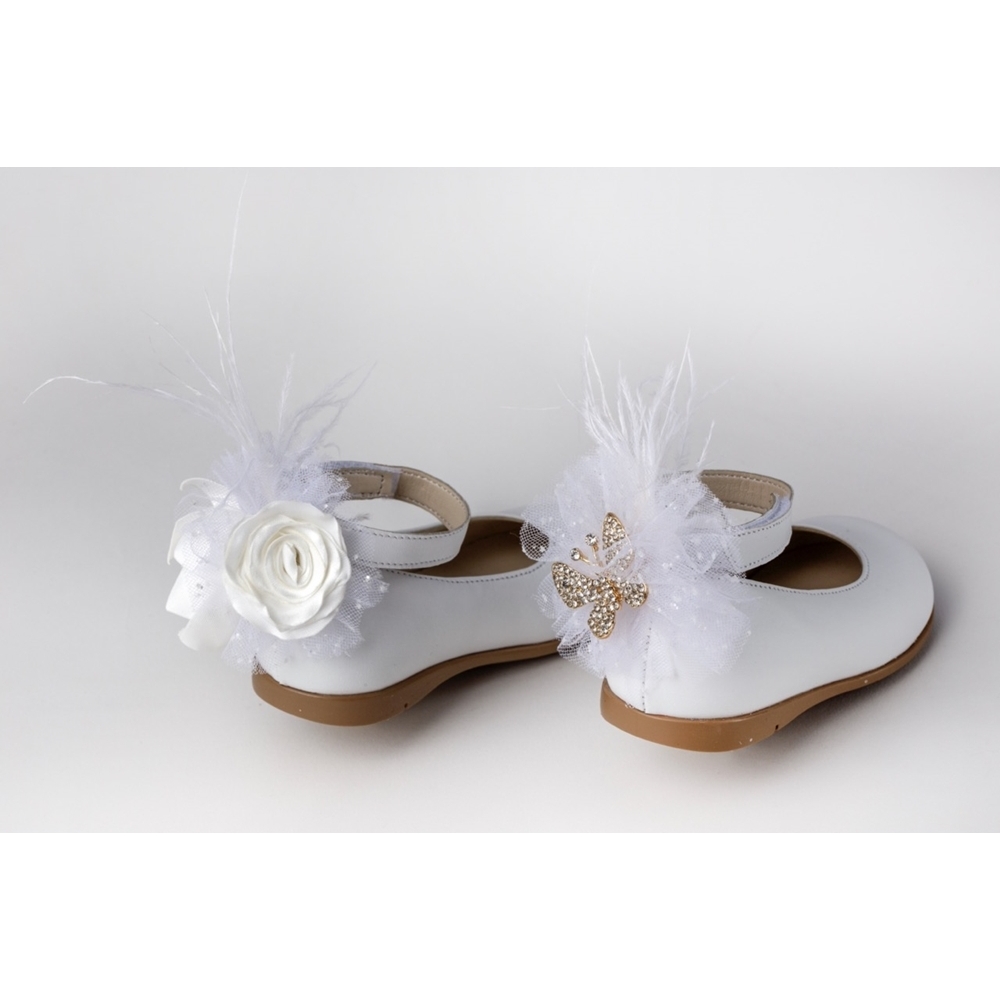 Μπαλαρίνα περπατήματος από λευκό δέρμα, διακοσμημένη με σατέν λουλούδια τούλι, γκλίτερ φτερά και μεταλλική πεταλούδα στο δεξί παπούτσι, κλείσιμο με velcro (“χρατς”) στον αστράγαλο.
