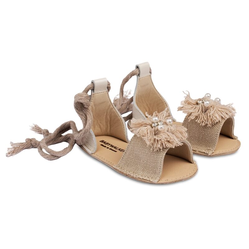 Δερμάτινο δετό pip toe με χειροποίητο μακραμέ διακοσμητικό, σε μπεζ χρώμα. Παπουτσάκια αγκαλιάς.