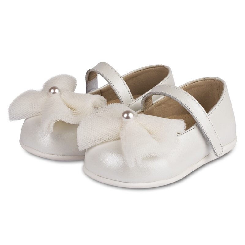 Δερμάτινο γοβάκι με μονή μπαρέτα και τούλινο φιόγκο με πέρλα, σε εκρού χρώμα. Παπουτσάκια για τα πρώτα βήματα.