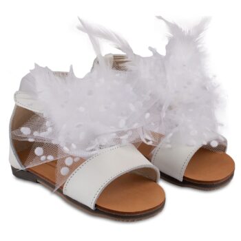Δερμάτινο πέδιλο σε εκρού χρώμα, διακοσμημένο με χειροποίητο υφασμάτινο διακοσμητικό με πουά τούλι και πούπουλα. Παπουτσάκια περπατήματος.