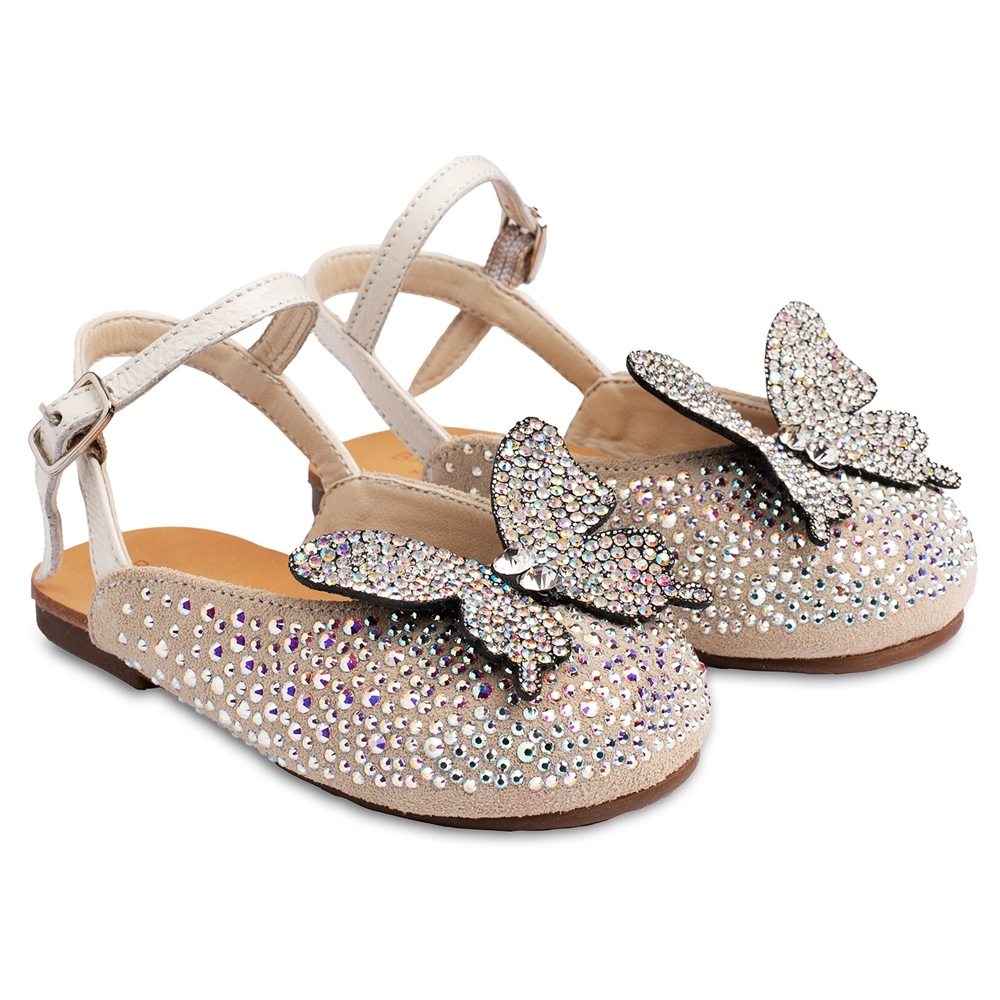 Σειρά Babywalker Luminosa: με κρύσταλλα από την SWAROVSKI INTERNATIONAL. Δερμάτινο σαμπό διακοσμημένο ολόγυρα με στρας και πεταλούδα, σε εκρού χρώμα. Παπουτσάκια περπατήματος.